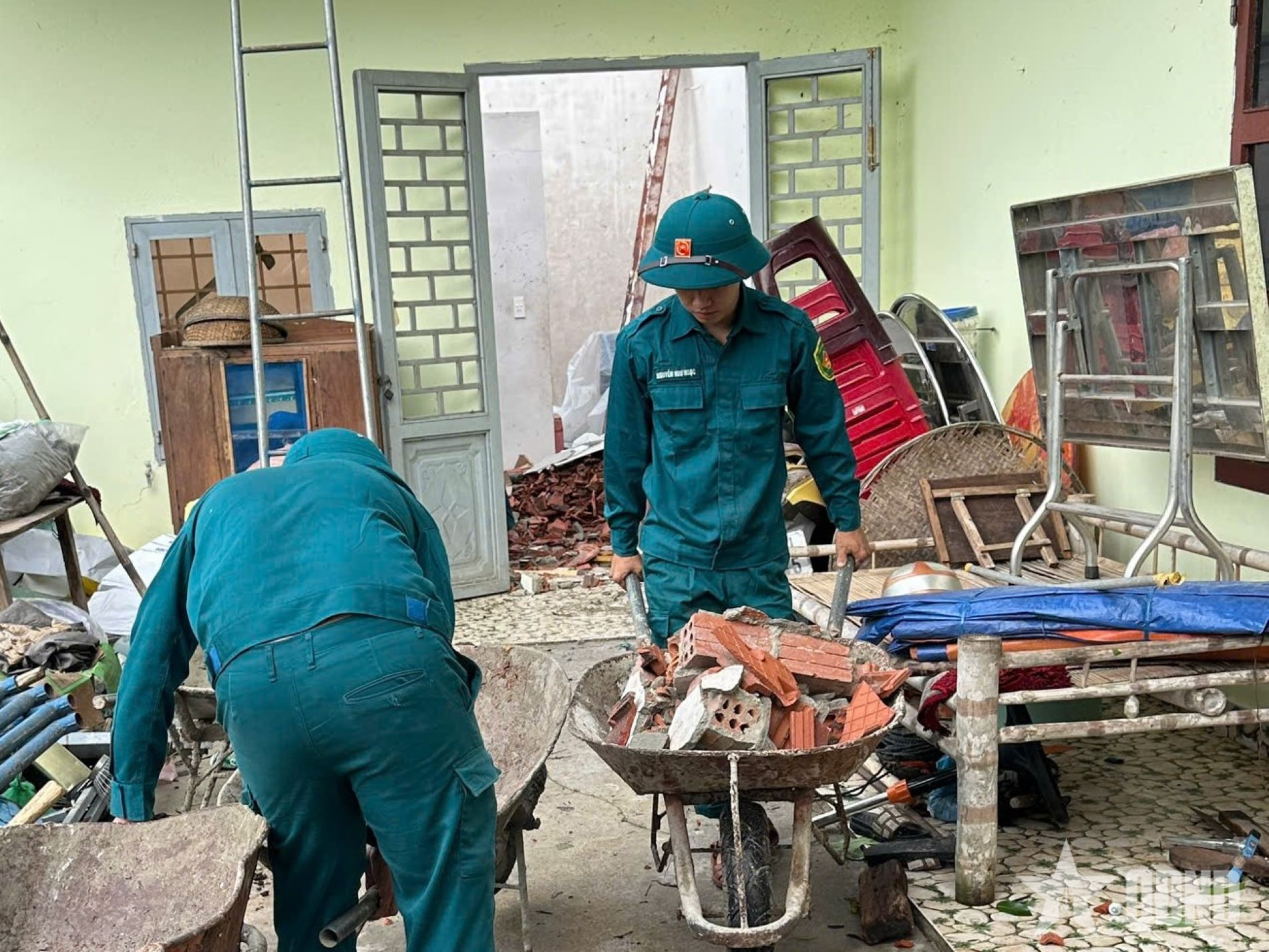 Lực lượng dân quân hỗ trợ người dân thôn Khánh Thọ (xã Chiên Đàn, TP Đà Nẵng) dọn dẹp nhà cửa sau lốc xoáy.