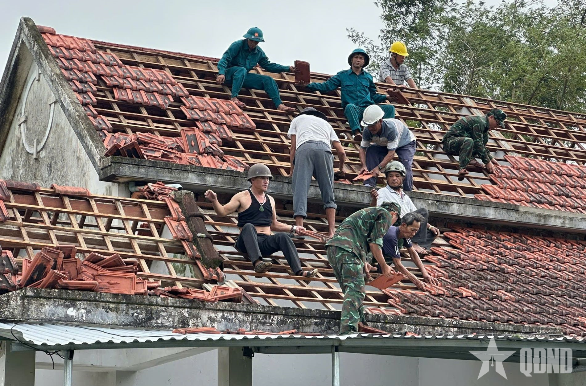 Các lực lượng giúp người dân thôn Khánh Thọ (xã Chiên Đàn, TP Đà Nẵng) lợp lại mái nhà sau lốc xoáy.