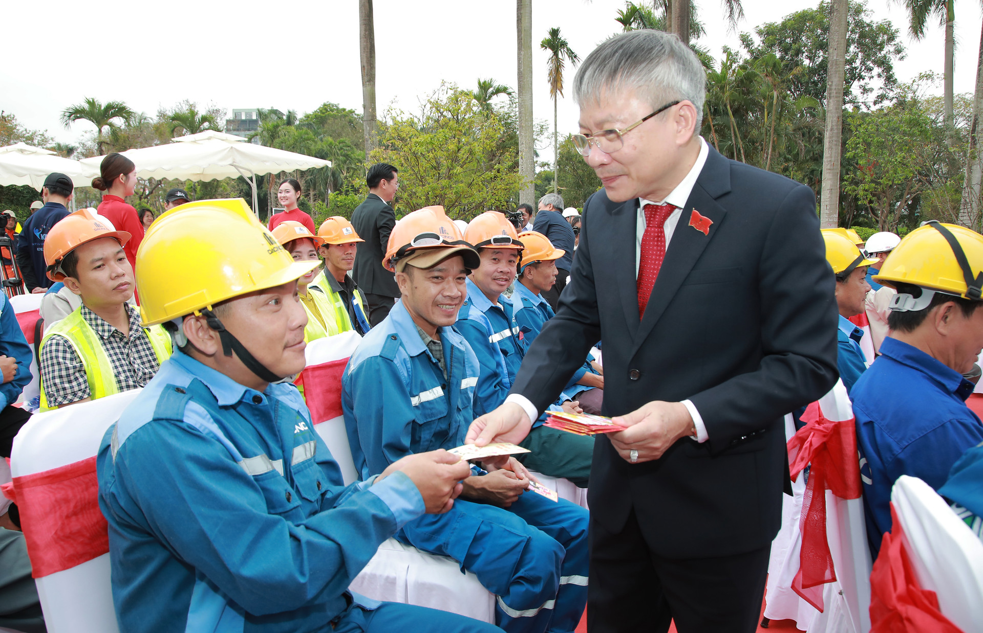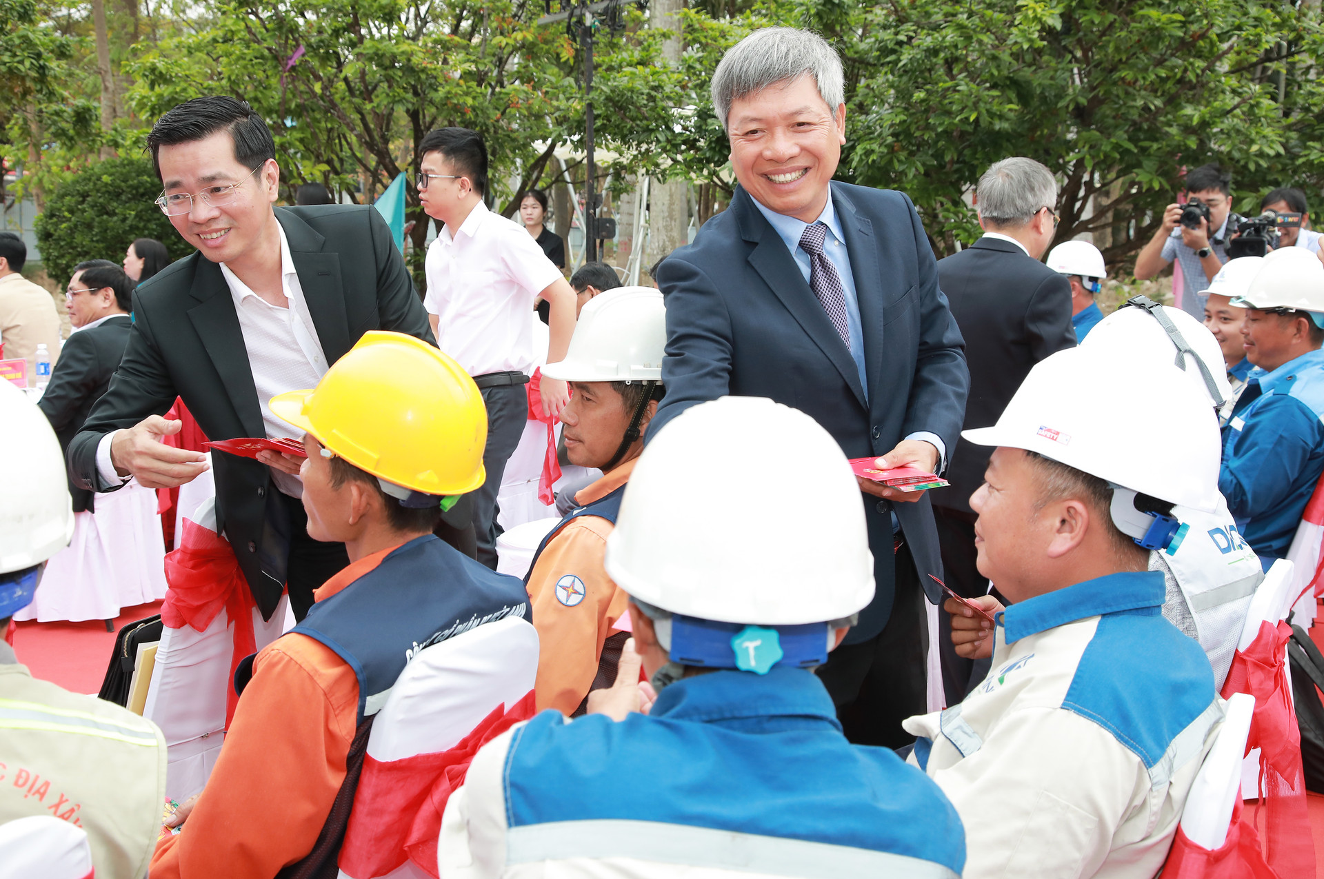 Chủ tịch HĐND thành phố Nguyễn Đức Dũng lì xì năm mới các công nhân tham gia thi công dự án. Ảnh: ĐẮC MẠNH