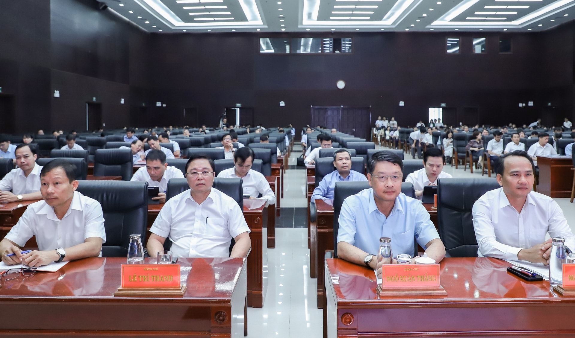 Phó Bí thư Thường trực Thành ủy Nguyễn Đình Vĩnh (bên phải), Phó Bí thư Thành ủy Ngô Xuân Thắng (thứ 2, bên phải sang) và các đại biểu dự hội nghị. Ảnh: NGỌC PHÚ