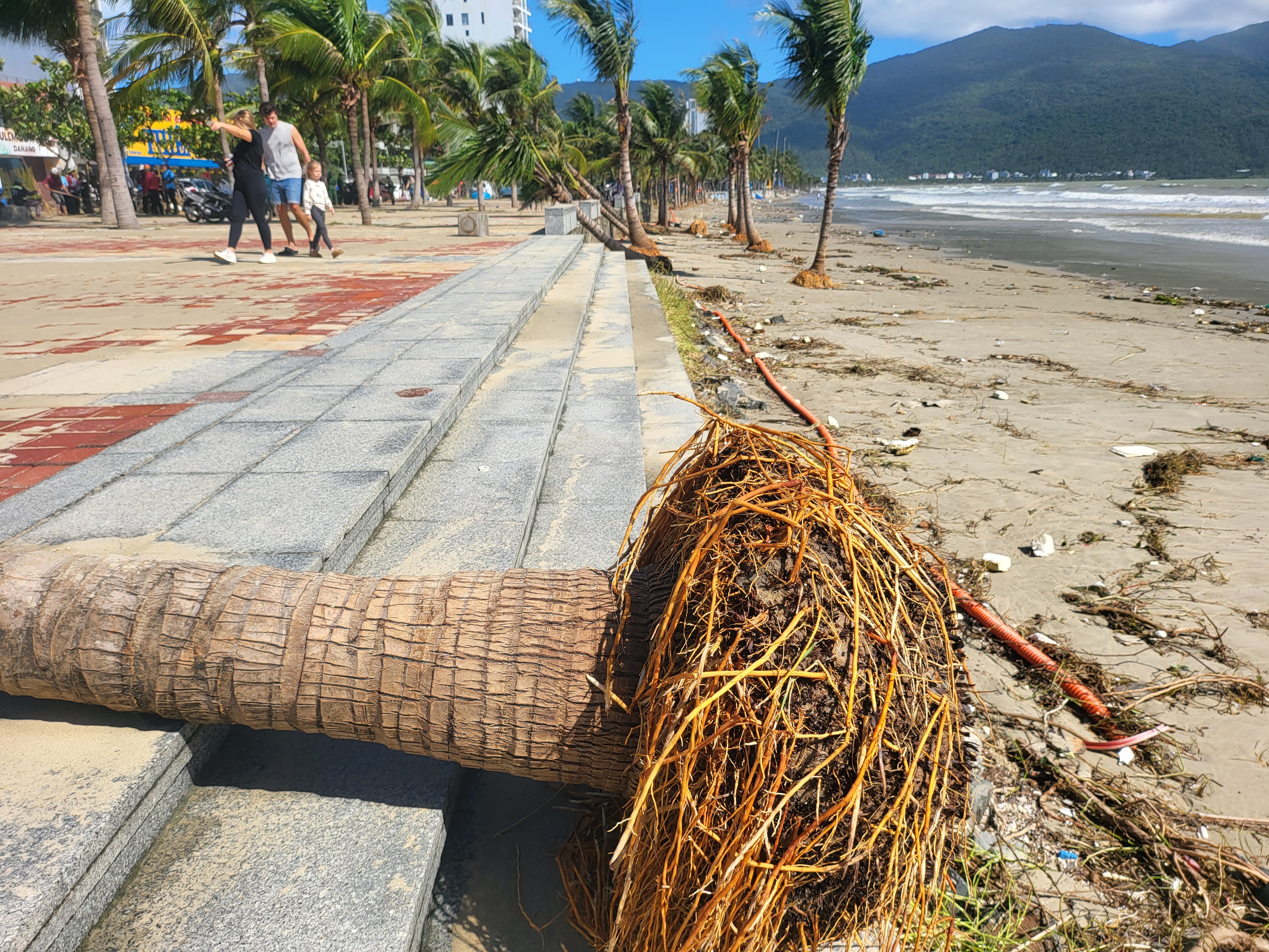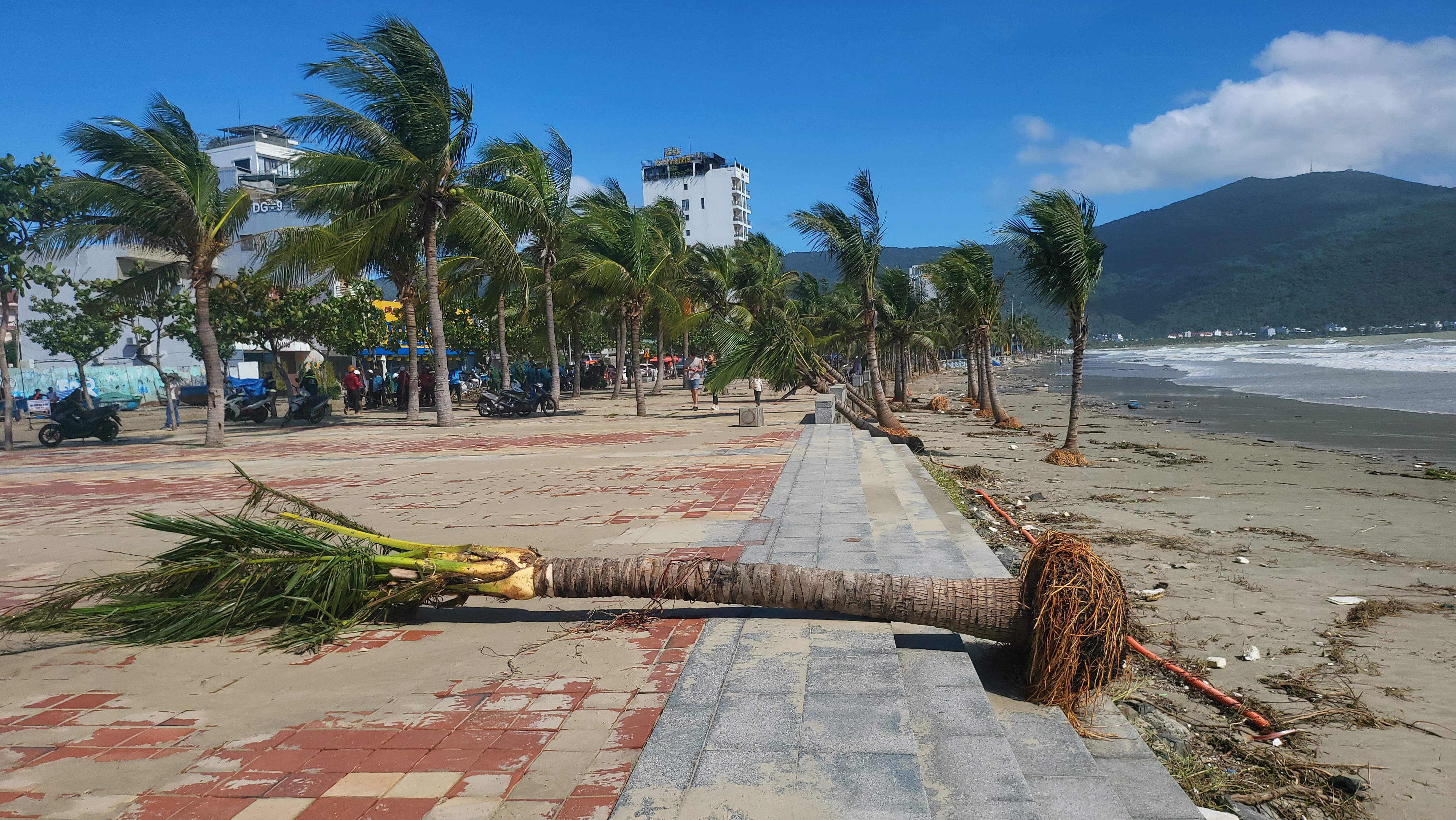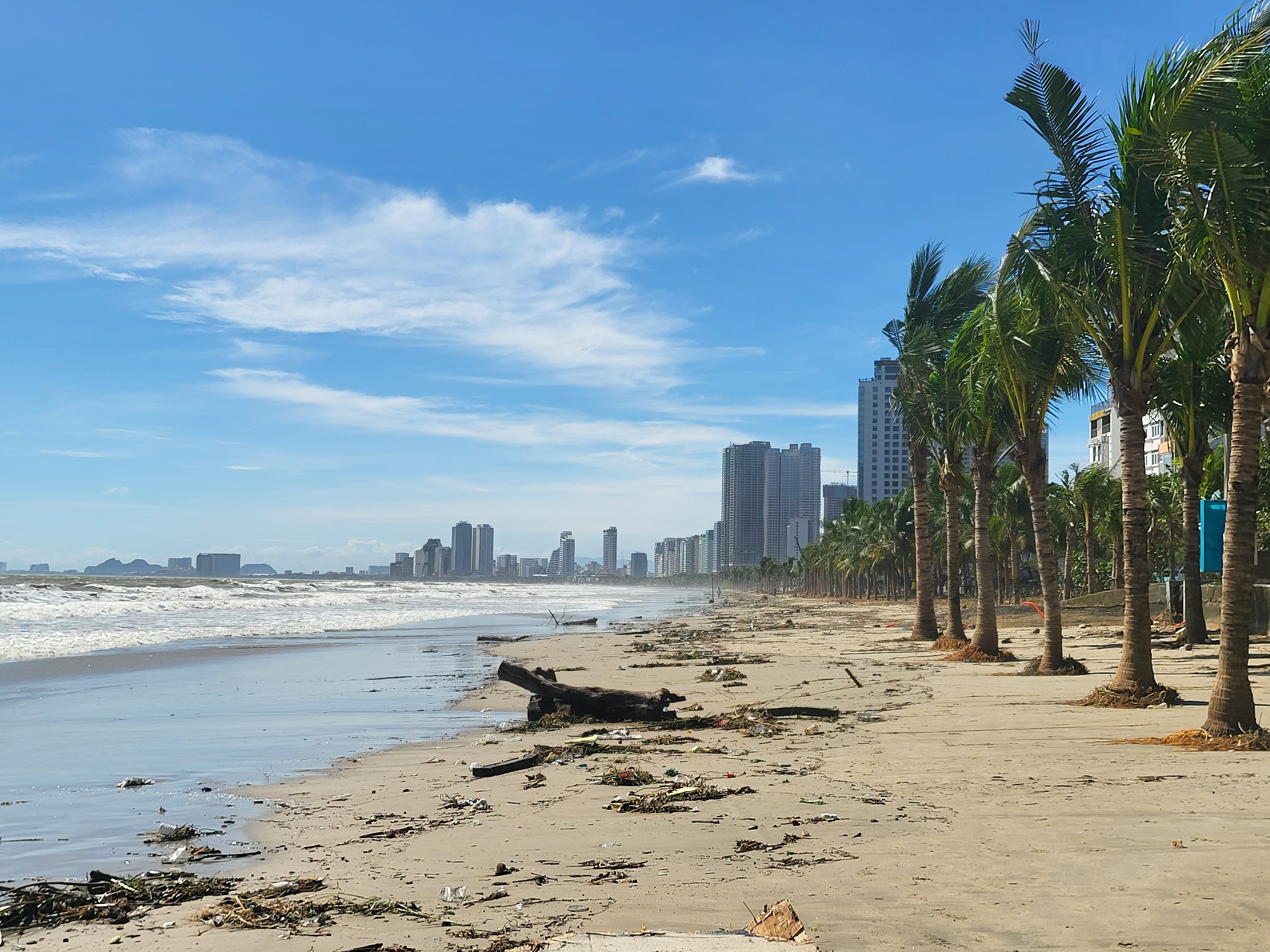 Sáng 7-11, sau bão số 13, tuyến đường Hoàng Sa (từ đoạn đối diện đường Lê Đức Thọ đến đường Vương Thừa Vũ, phường Sơn Trà, TP Đà Nẵng) ngập tràn rác thải bị sóng và nước mưa cuốn dồn, chất thành đống trên mặt đường. Nhiều cành cây gãy, lá vụn rơi vương vãi, gây cản trở giao thông.