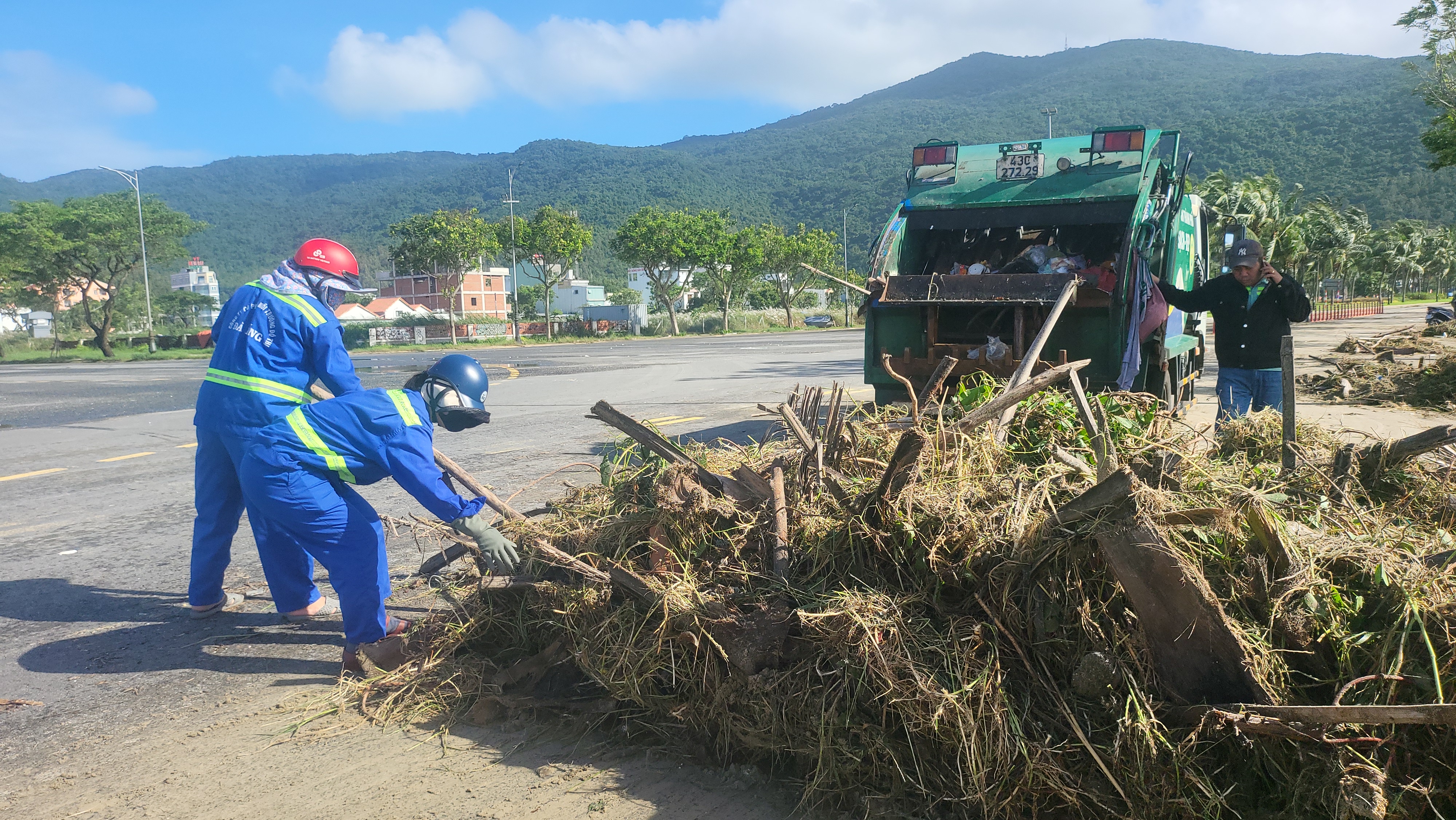 Lực lượng chức năng dọn rác tấp đầy đường ven biển Sơn Trà sau bão số 13. Thực hiện: XUÂN QUỲNH