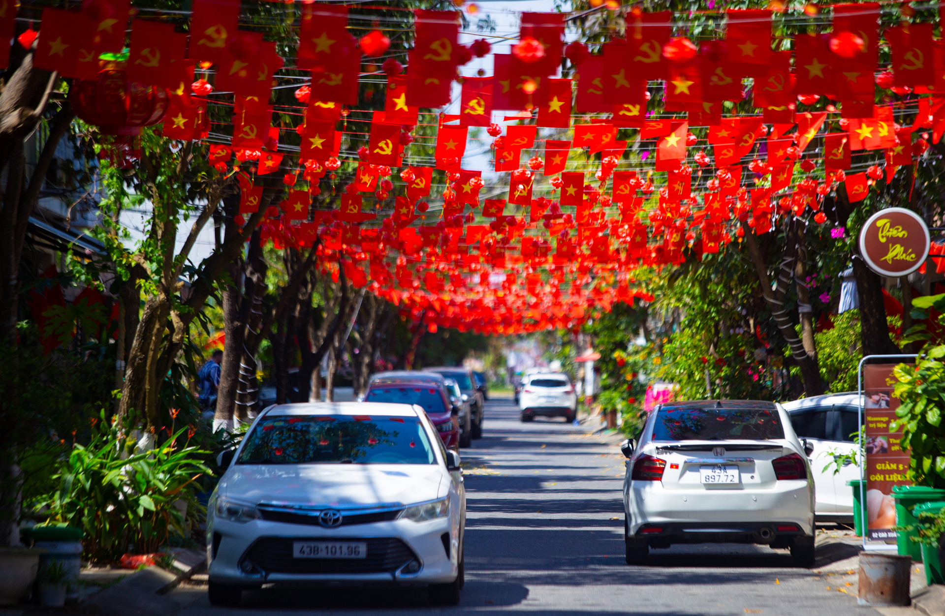 Một tuyến đường rực rỡ cờ đỏ sao vàng. Ảnh: BẢO LÂM