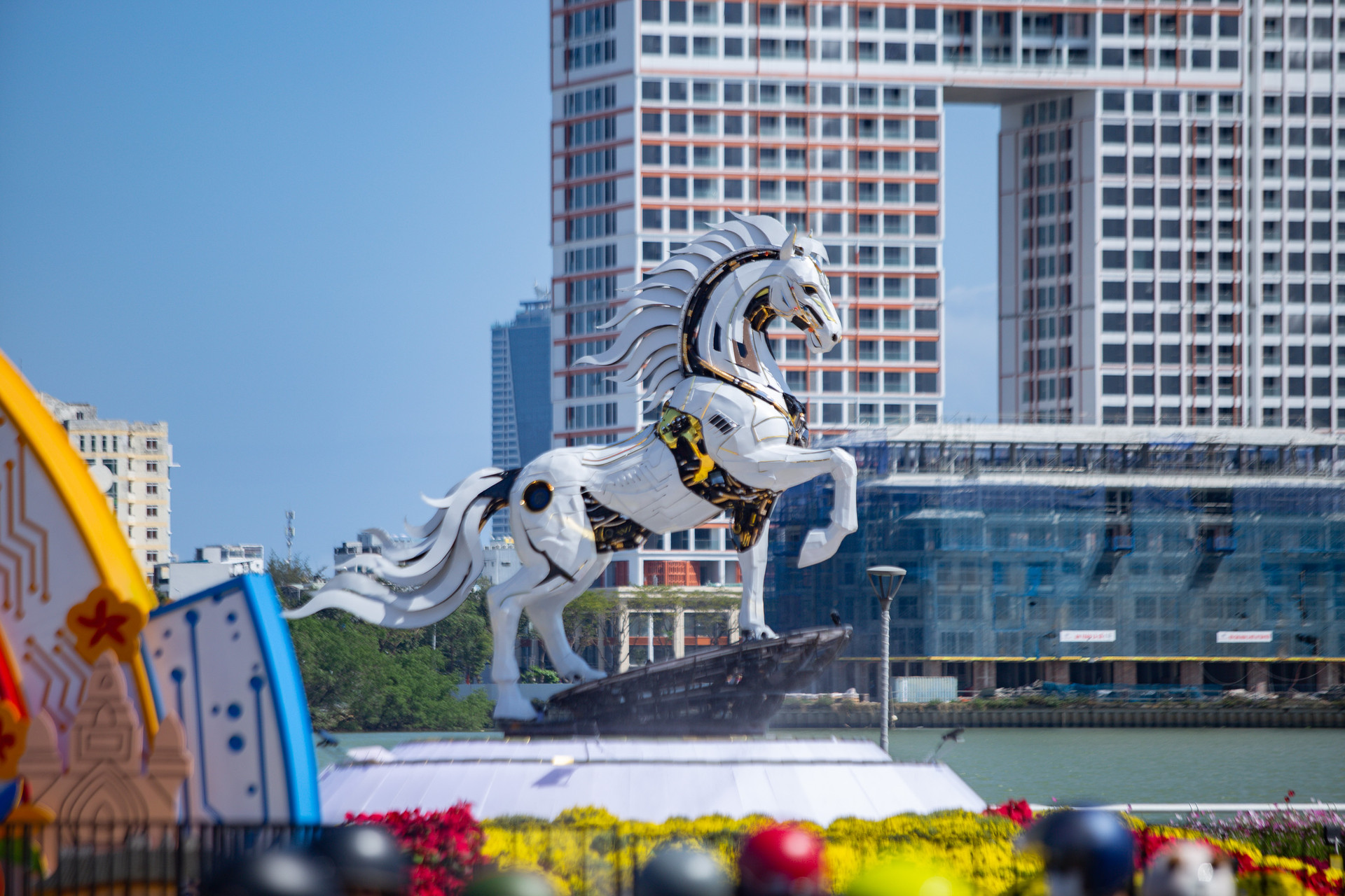 Linh vật “Kim Mã 4.0” được bố trí tại khu vực sàn cảnh quan phía nam, đoạn đuôi cầu Rồng với tạo hình ấn tượng cho người dân, du khách. Ảnh: BẢO LÂM