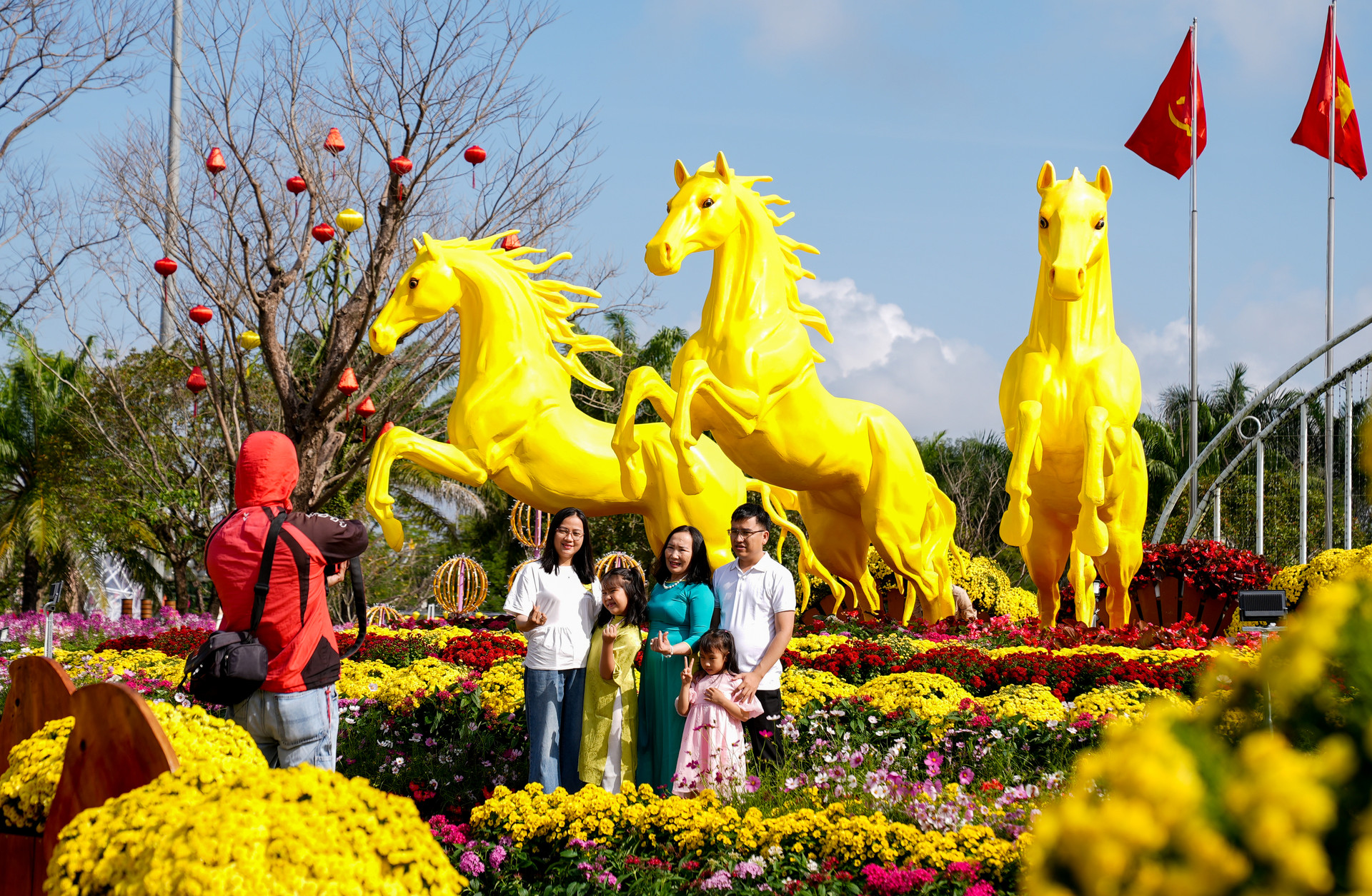 Linh vật Ngựa năm Bính Ngọ tại Quảng trường 24/3 (phường Bàn Thạch) thu hút đông đảo du khách chụp hình lưu niệm. Ảnh: HỒ QUÂN