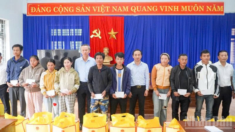 Phó Chủ tịch Hội đồng nhân dân thành phố Đà Nẵng Đoàn Ngọc Hùng Anh và lãnh đạo xã Trà Tân tặng quà cho người dân vùng sạt lở.