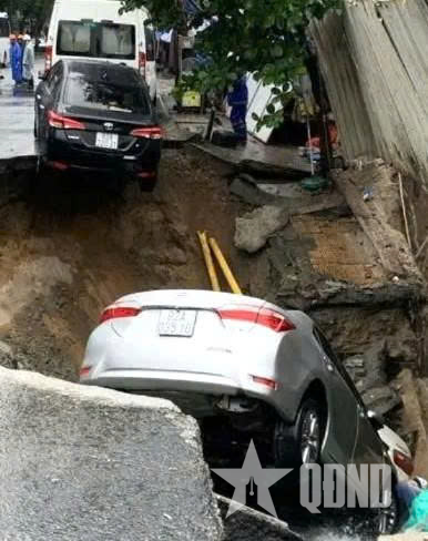 Hiện trường 2 xe ô tô bị rơi xuống hố tại đường Nguyễn Công Trứ, TP Đà Nẵng.