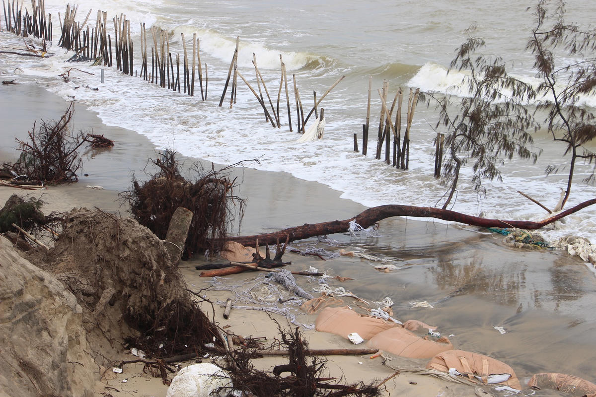 Ông Nguyễn Đây (bảo vệ của một homestay ở khu vực này) cho biết: “Triều cường tấn công quá mạnh, nhất là những trận bão vừa qua. Cứ mỗi lần sóng ập vào bờ là từng mảng cát bị kéo tuột xuống biển, để lại những vệt hàm ếch sâu hoắm chạy dài dọc bờ. Những cây dương liễu trước đây còn ở trên này, giờ đã trôi xuống biển hết. May hôm đó bộ đội đến kịp, thả khối bê tông và bao cát xuống gia cố, chứ không thì rất nguy hiểm”.