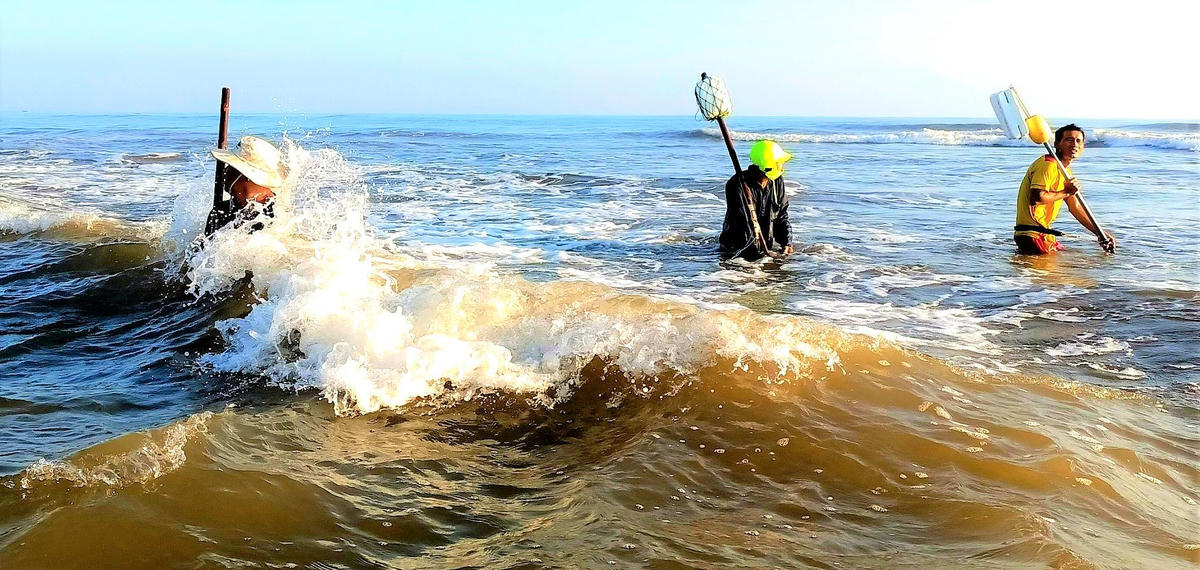 Người dân xã Tam Xuân đang cào ốc gạo ở dọc ven bờ biển. Ảnh: Tấn Thành.