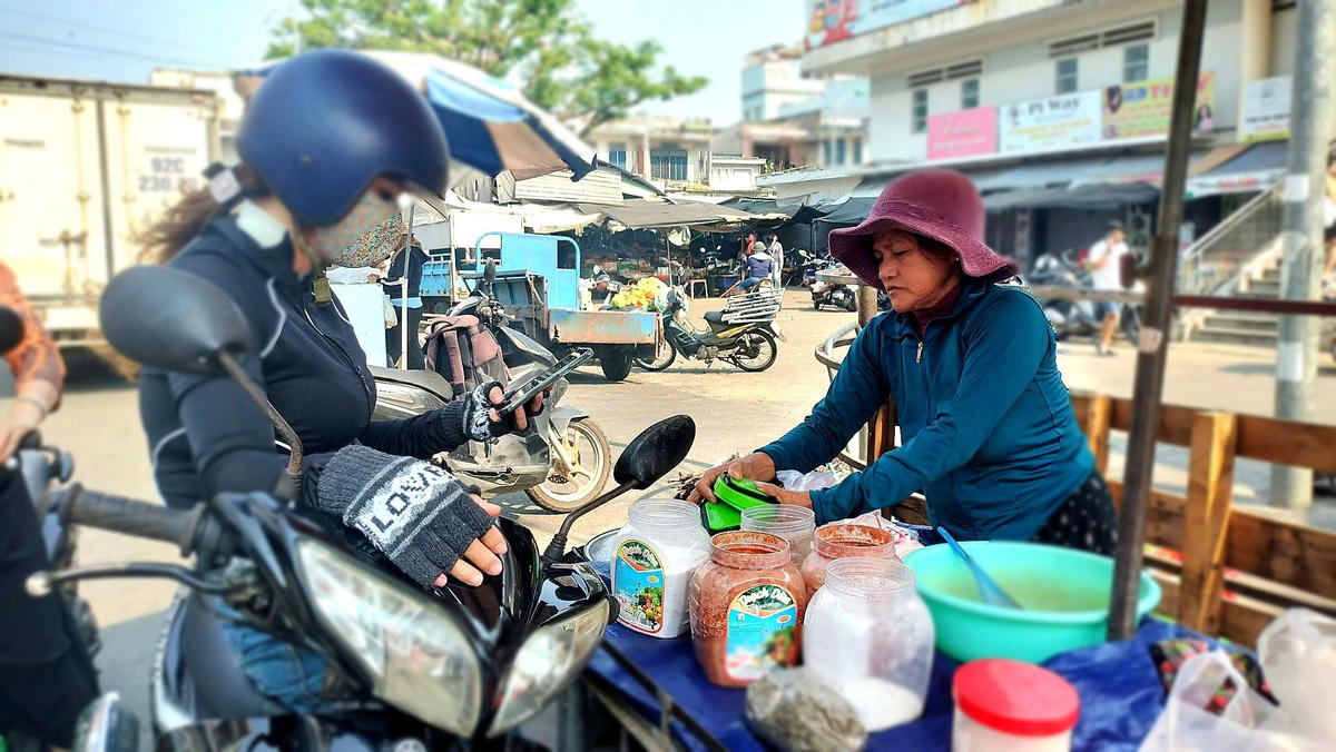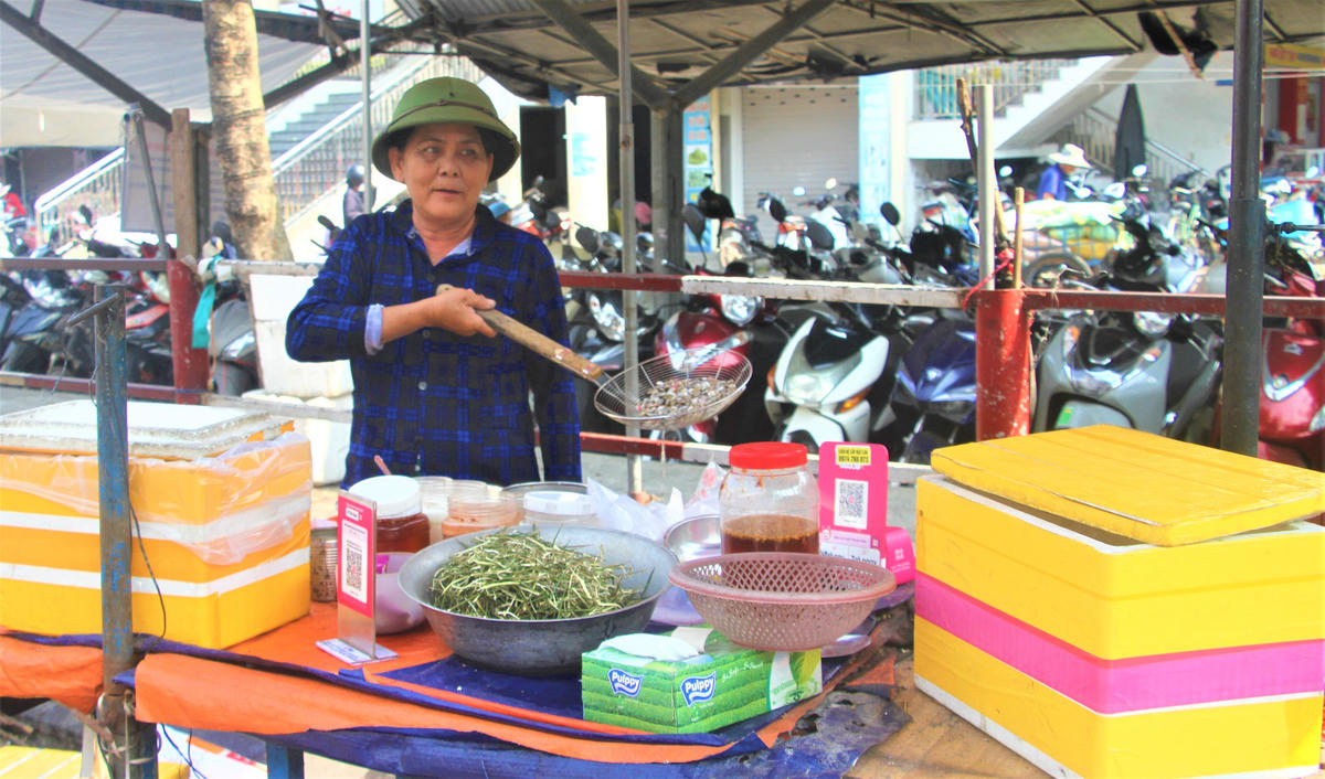 Bà Thái Thị Vũ Hoa chia sẻ về bán ốc gạo. Ảnh: Chí Đại.