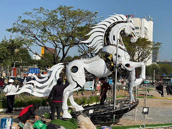 Linh vật thứ hai trong bộ sưu tập trang trí Tết Bính Ngọ 2026 tại Đà Nẵng là mô hình ngựa máy mang tên “Kim Mã 4.0”, được bố trí tại khu vực sàn cảnh quan đuôi cầu Rồng. Tác phẩm có quy mô ấn tượng với chiều cao 4,3m, chiều dài 5,1m, bề rộng phần đế 2,6m, trở thành biểu trưng nổi bật cho hình ảnh Đà Nẵng của “Tương lai” – hiện đại, bứt phá và giàu khát vọng.