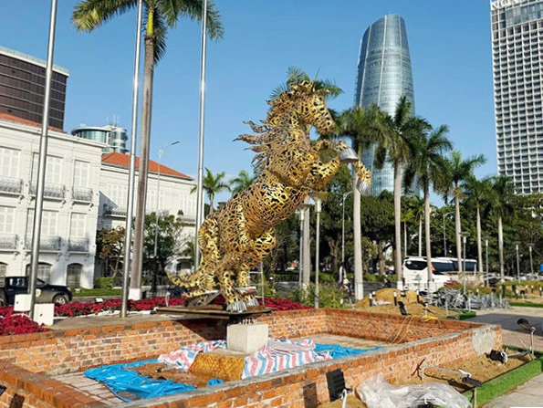 Linh vật Bính Ngọ 2026 đặt tại sàn cảnh quan đuôi cầu Rồng.