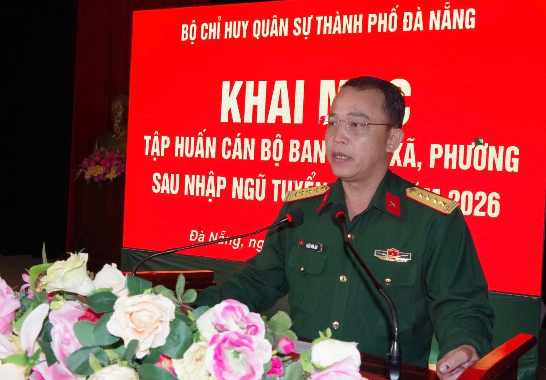 Đại tá Trần Hữu Ích, Chỉ huy trưởng Bộ Chỉ huy Quân sự thành phố phát biểu tại buổi khai mạc. Ảnh: HẢI HÀ