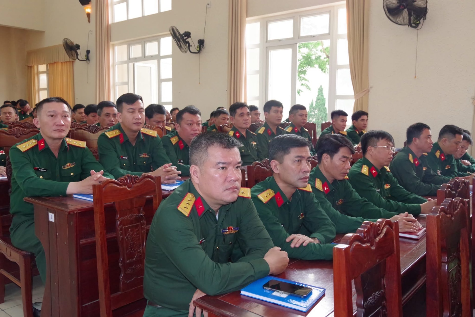 Lớp tập huấn nhằm nâng cao chất lượng tham mưu và tổ chức thực hiện nhiệm vụ quân sự, quốc phòng ở cơ sở cho cán bộ Ban Chỉ huy Quân sự xã, phường. Ảnh: HẢI HÀ