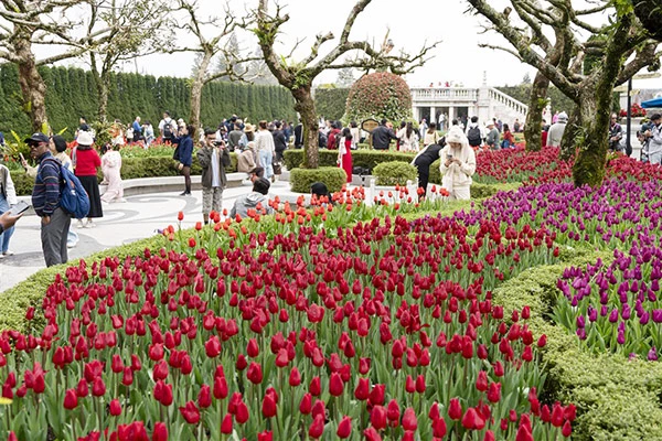 Du khách trong và ngoài nước thưởng ngoạn hàng triệu bông hoa tulip bừng nở trên đỉnh Núi Chúa thuộc khu du lịch Sun World Ba Na Hills.