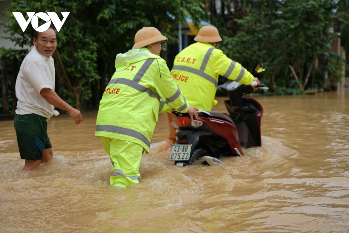 Cảnh sát giao thông hỗ trợ người dân đưa xe máy ra khỏi vùng ngập