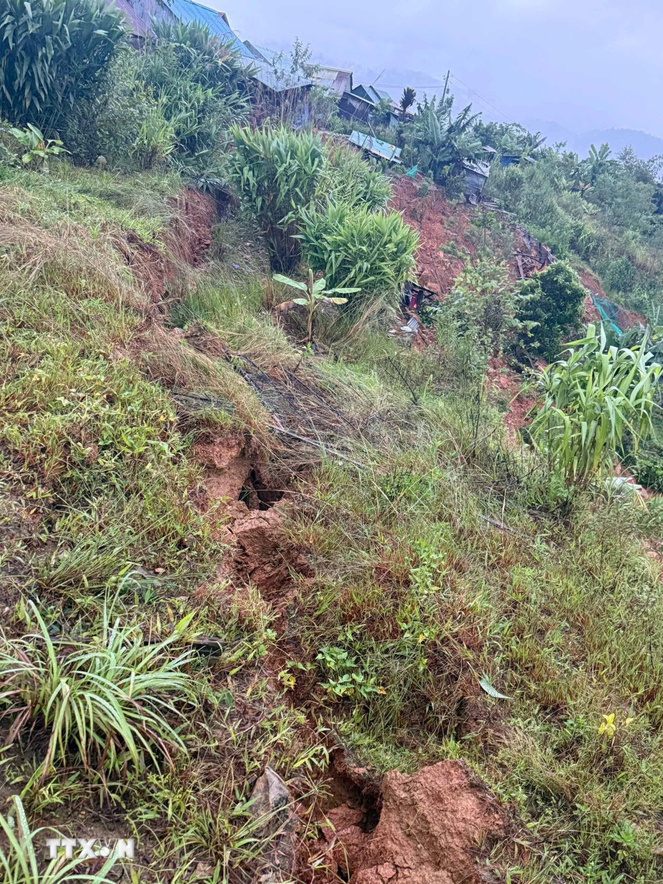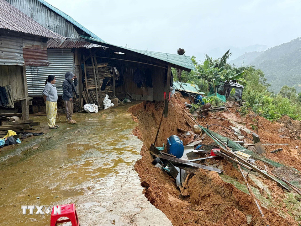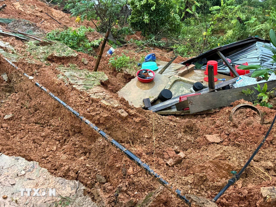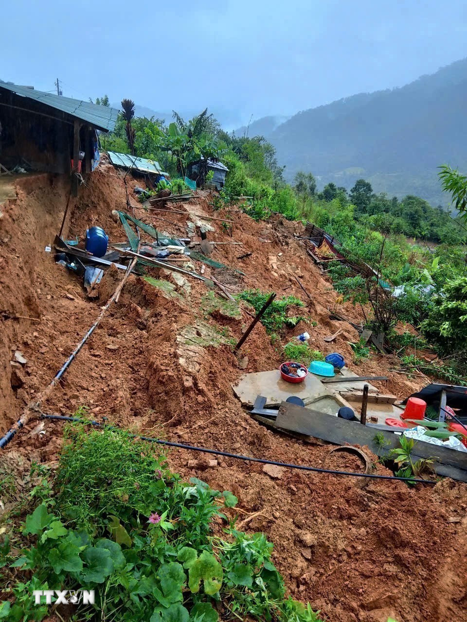 Mưa lớn trong nhiều ngày qua đã khiến đồi núi cao tích tụ lượng nước lớn, xuất hiện nhiều điểm sạt lở núi tại khu dân cư thôn Pứt, xã biên giới Hùng Sơn, thành phố Đà Nẵng. (Ảnh: Đoàn Hữu Trung/TTXVN)