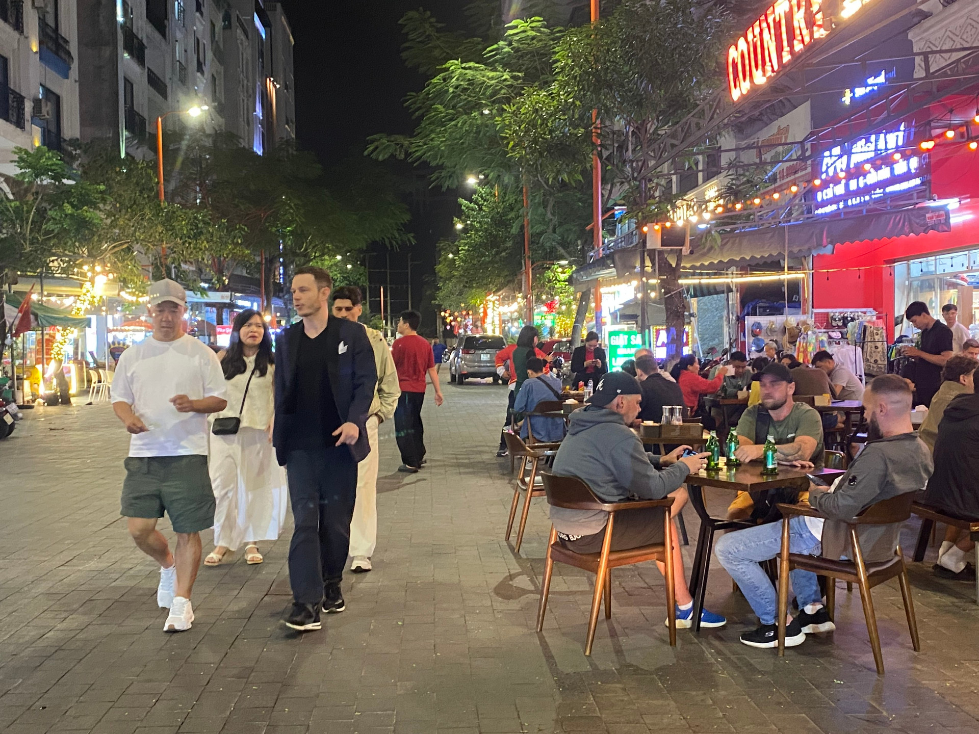 Dù đã hơn 23 giờ, khu phố An Thượng vẫn tấp nập. Trên các tuyến đường Trần Bạch Đằng, Hoàng Kế Viêm, An Thượng 2, 3, 4…, du khách từ châu Âu, Hàn Quốc, Ấn Độ… vẫn thong dong dạo chơi, thưởng thức ẩm thực hoặc thư giãn tại các spa ven đường. Cảnh tượng này cho thấy nhu cầu trải nghiệm thực tế của nhiều khách quốc tế khi đến một vùng đất mới.