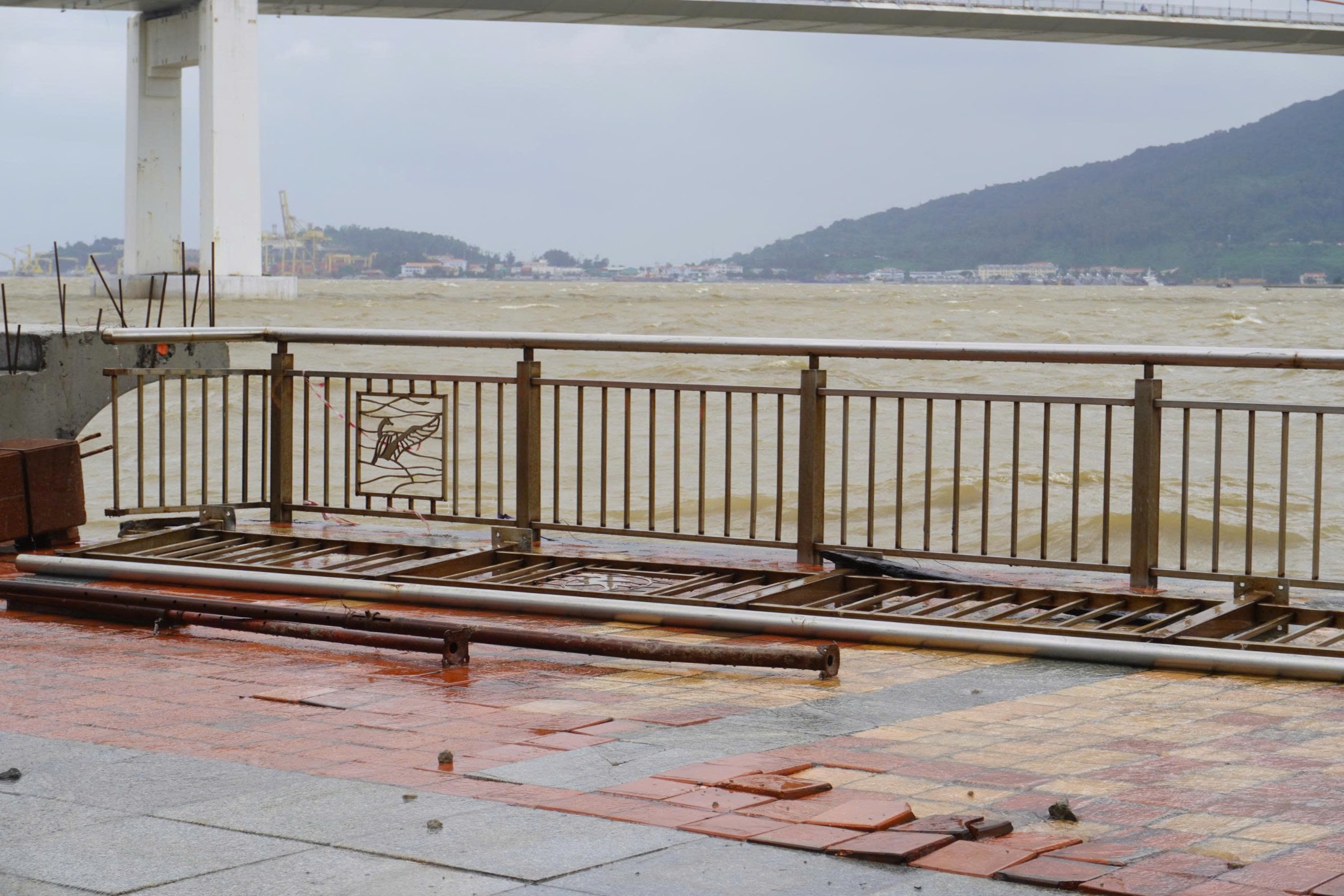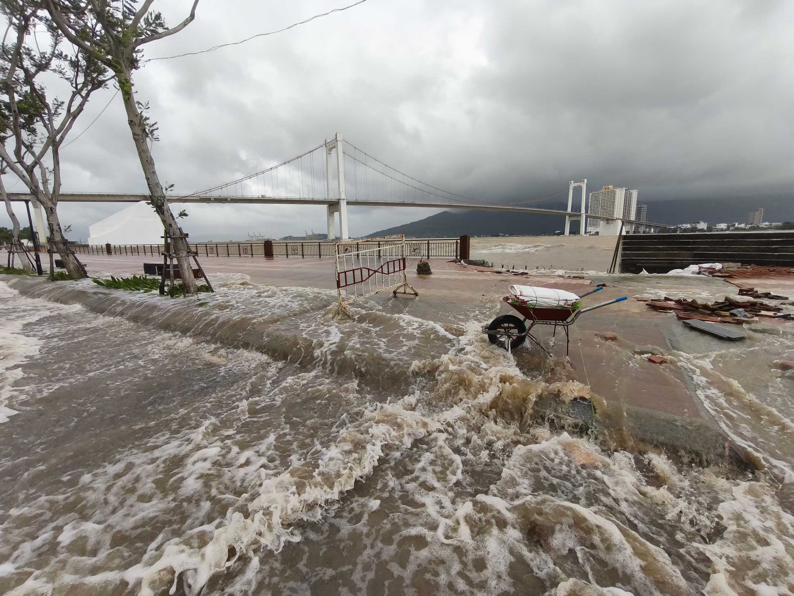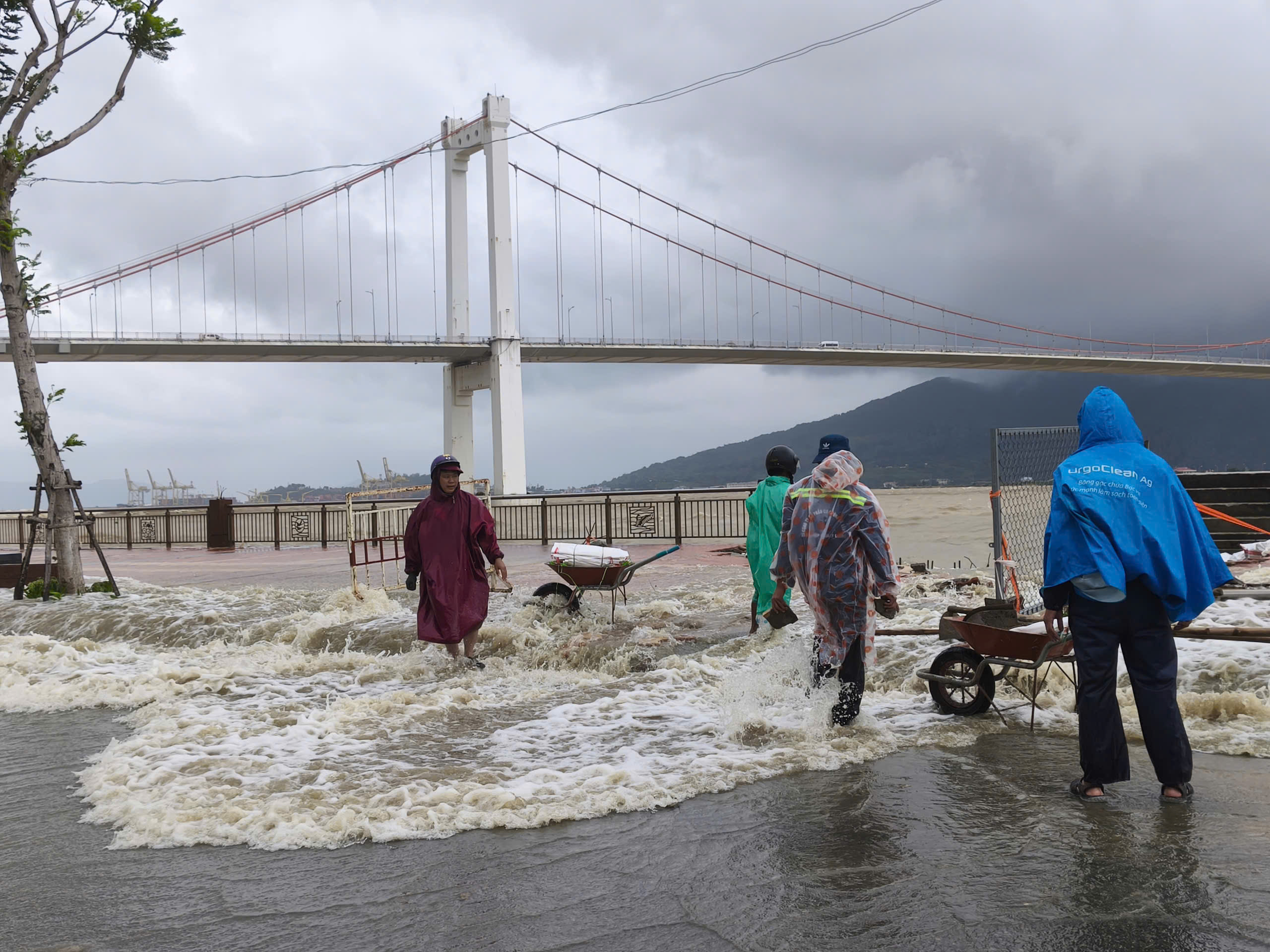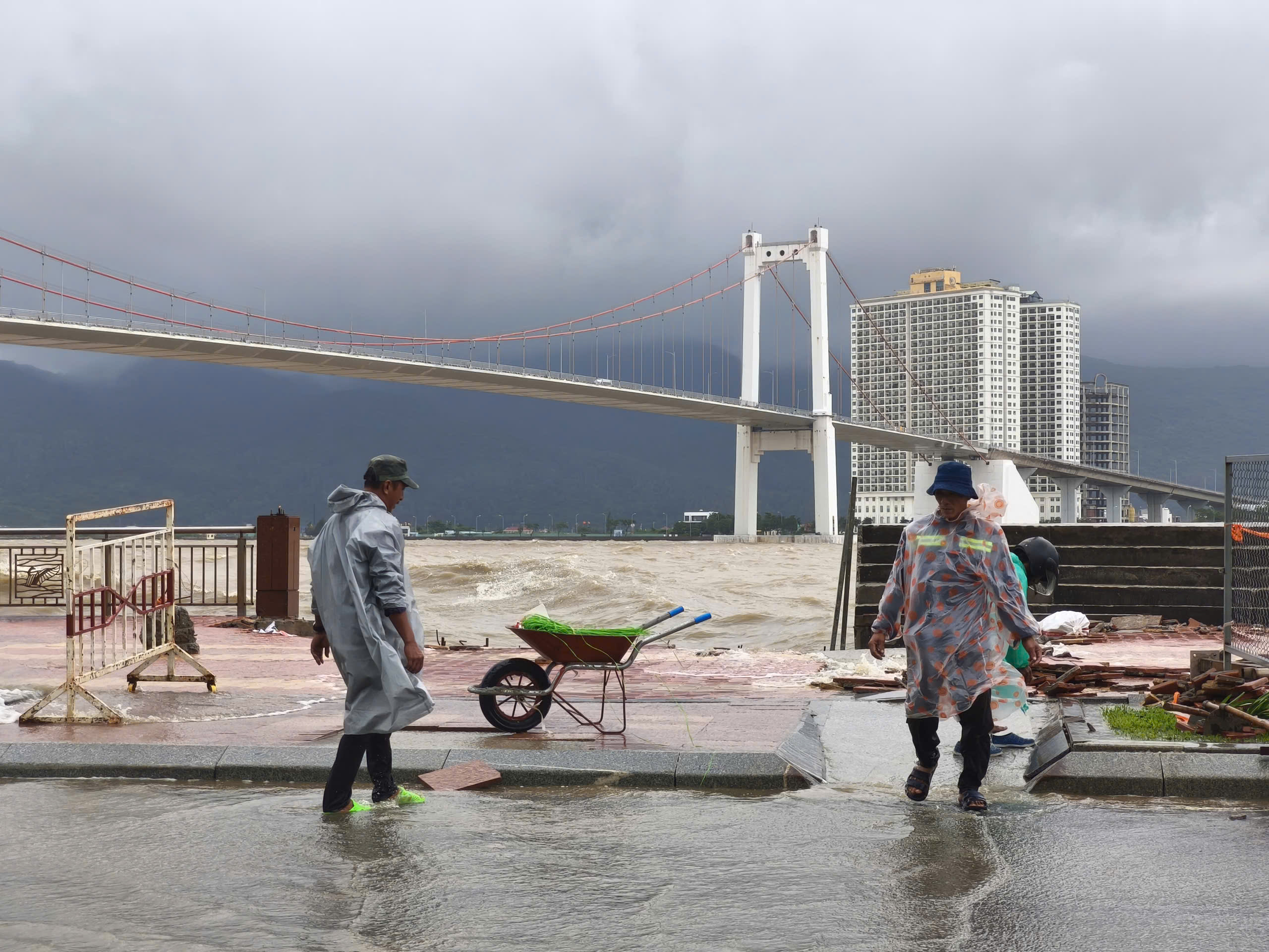 Nước biển dâng cao, đổ ngược về sông Hàn, tạo nên từng đợt sóng lớn liên tục đánh vào bờ