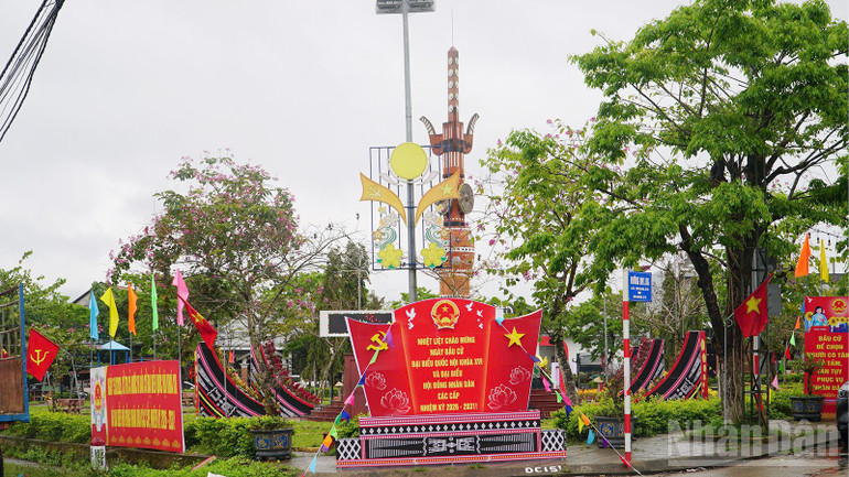 Pa-nô, áp phích tuyên truyền ngày hội non sông được treo trên nhiều tuyến đường, công viên của các xã miền núi Đà Nẵng. Trong ảnh là tấm pa-nô lớn được đặt tại xã Sông Vàng.