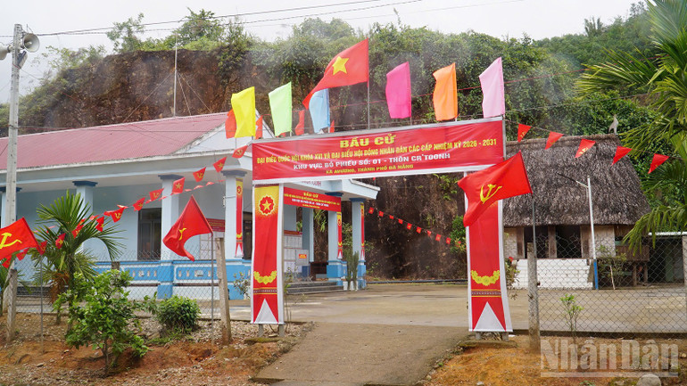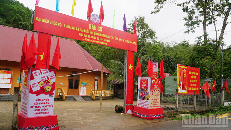 Hình ảnh trang hoàng rực rỡ tại khu vực bỏ phiếu số 11 xã Sông Kôn.