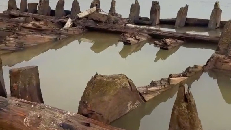 Một phần thân tàu cổ phát lộ sau khi thủy triều xuống. (Ảnh: Người dân cung cấp)
