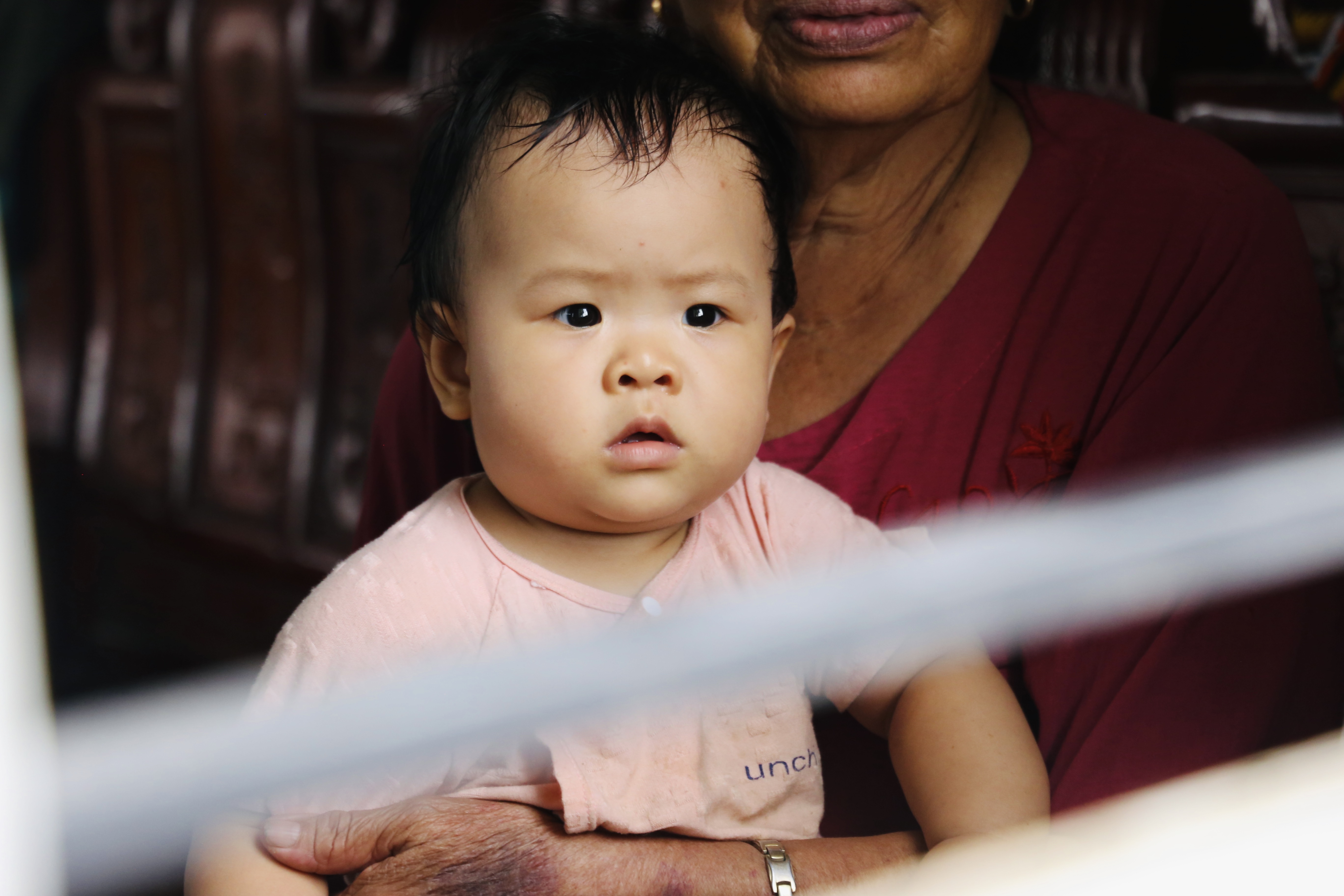 Những em nhỏ được người lớn trông giữ cẩn thận trong bối cảnh quanh nhà còn nhiều điểm ngập sâu