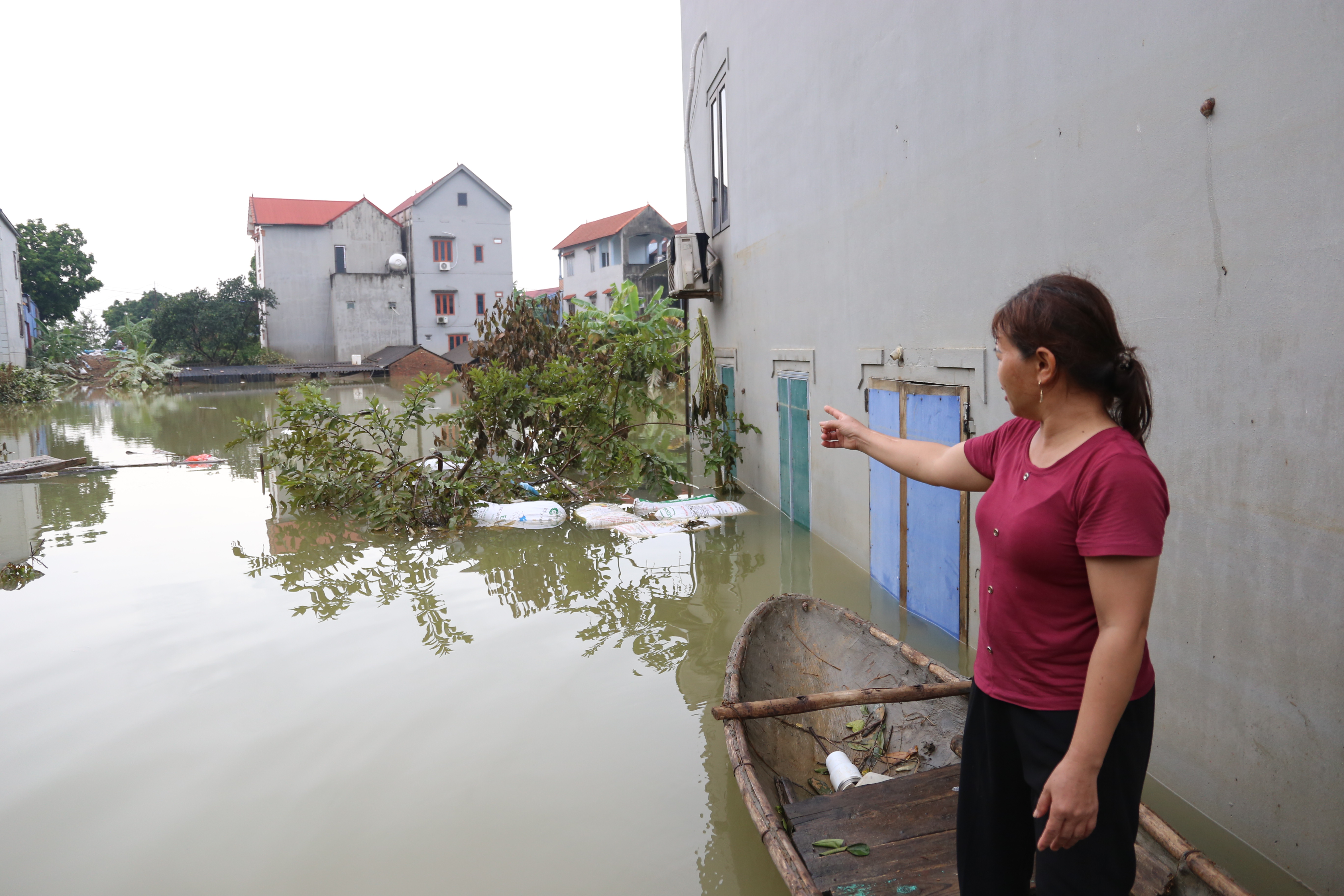 Chỉ tay lên bức tường nhà còn hằn dấu vết mực nước đỉnh lũ dâng cao, chị Nguyễn Thị Bài (thôn Ngô Đạo, xã Đa Phúc) cho biết sau 5 ngày nước đã rút được khoảng 3 mét song tại mảnh vườn bên nhà chị, nước vẫn ngập tới ngọn cây ổi.