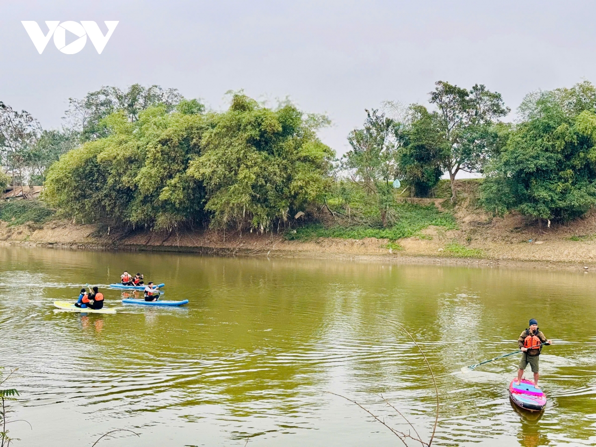 Du khách trải nghiệm chèo thuyền trên sông Cà Lồ tại khu vực xã Đa Phúc, Hà Nội.