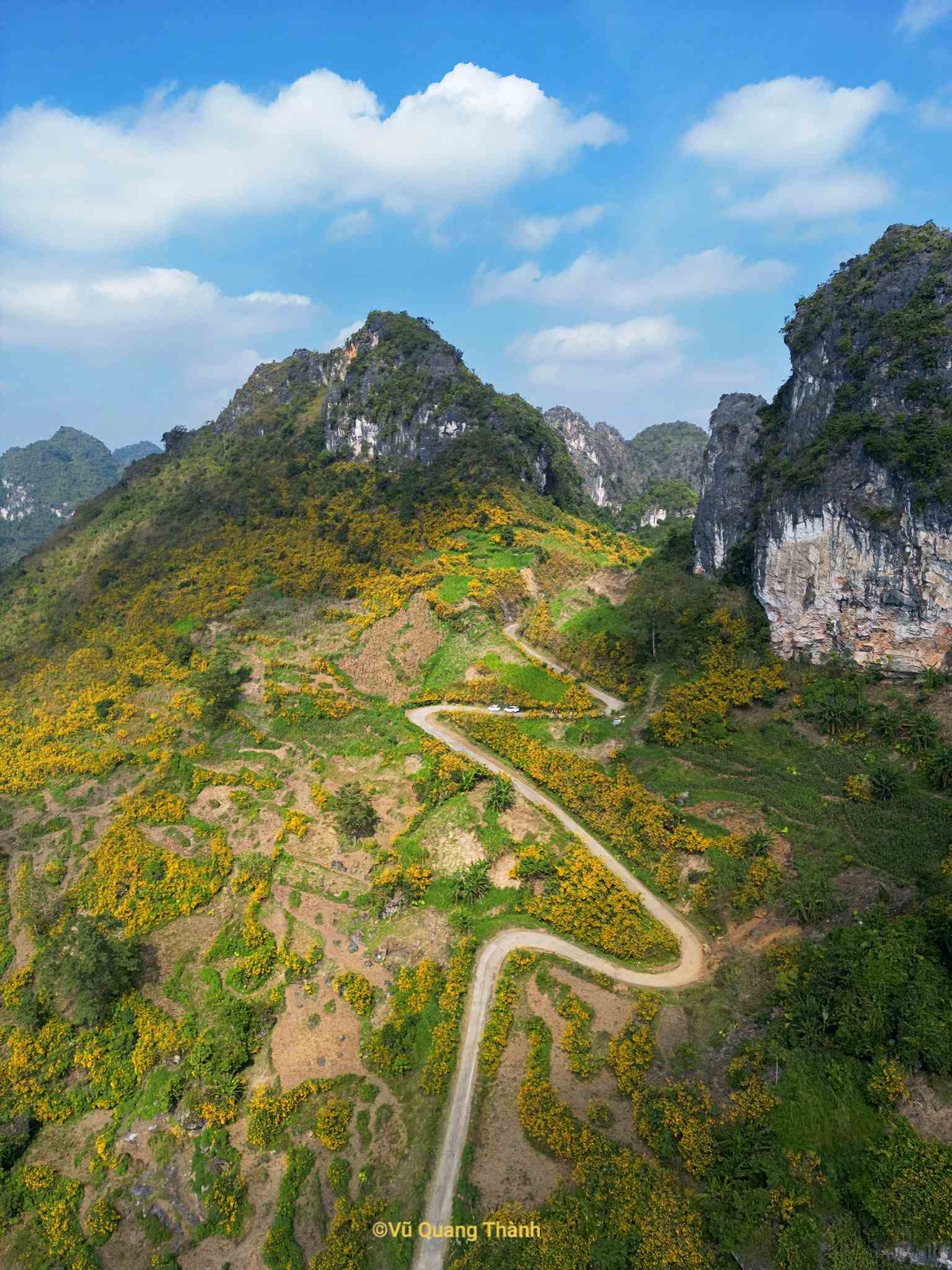 Vào khoảng thời gian này, Hạ Lang không chỉ nổi bật với triền hoa dã quỳ trải vàng, mà còn gần các điểm du lịch nổi tiếng như đồi cỏ cháy Vinh Quý, động Ngườm Bang. Du khách cũng có thể kết hợp trải nghiệm ngắm hoa trạng nguyên và hoa tam giác mạch. Ảnh: Vũ Quang Thành