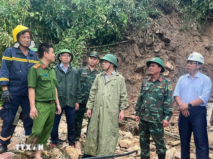 Lãnh đạo tỉnh Khánh Hòa nghe lực lượng cứu hộ, cứu nạn thông tin về việc tìm kiếm nạn nhân. (Ảnh: Phan Sáu/TTXVN)