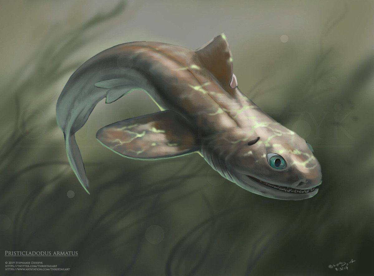 Tổ tiên của cá mập hiện đại. Cladoselache được coi là mắt xích tiến hóa quan trọng, đặt nền móng cho hình thái và hành vi săn mồi của các loài cá mập sau này. Ảnh: Pinterest.