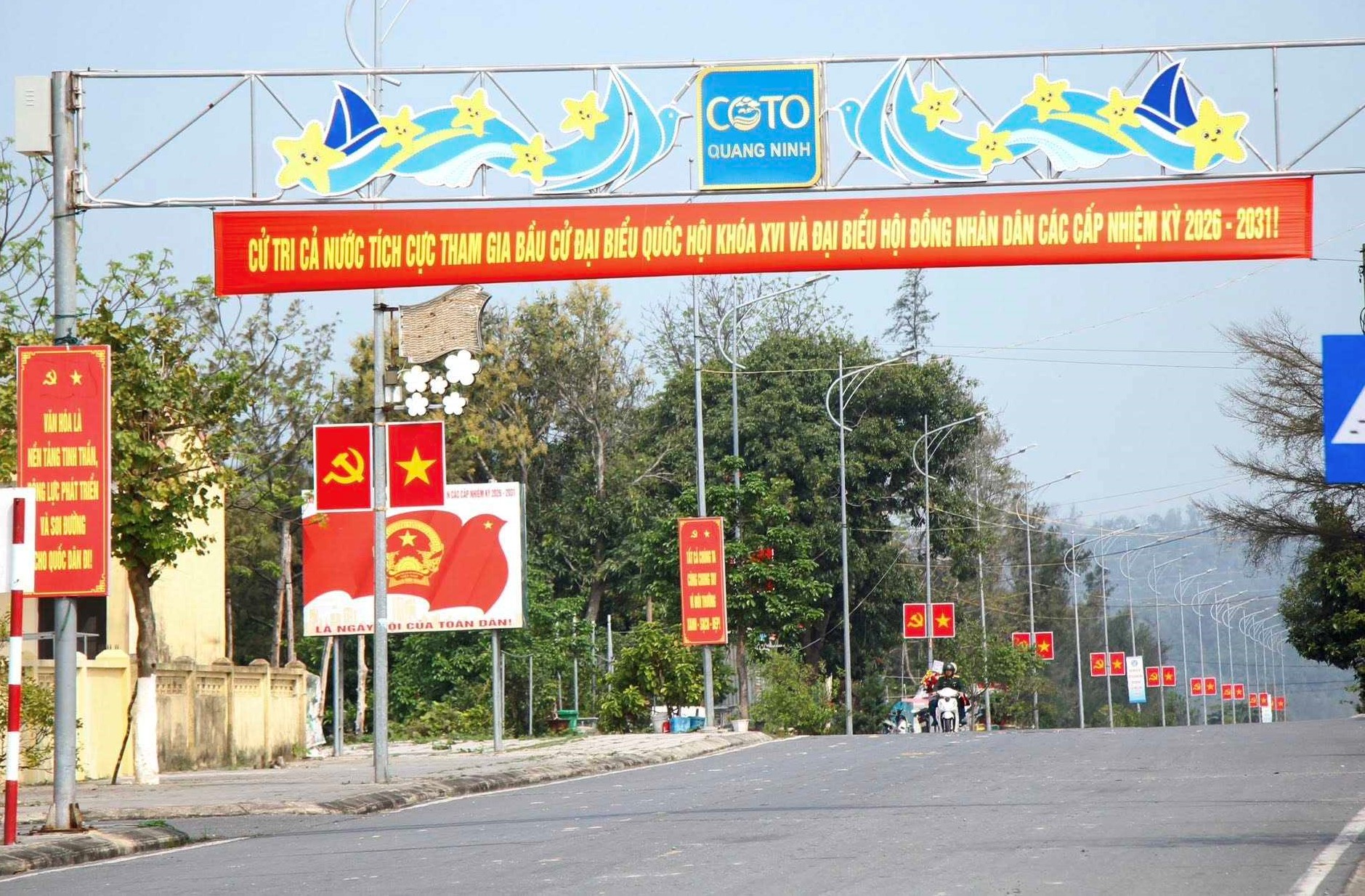 Nhiều tuyến đường, khu dân cư ở đặc khu Cô Tô rực rỡ cờ hoa, pa-nô tuyên truyền ngày bầu cử. Ảnh: THU BÁU