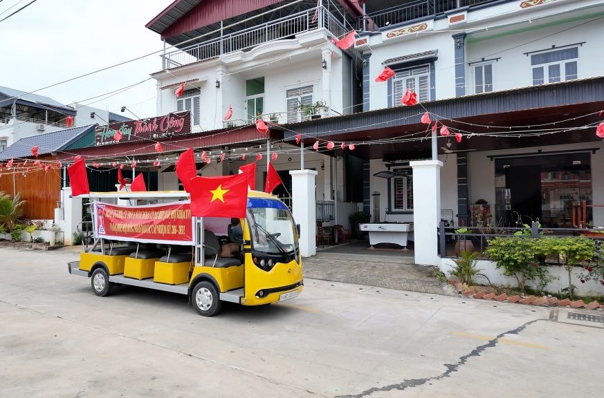 Sử dụng xe điện đi tuyên truyền lưu động về bầu cử tại các thôn, xóm ở đặc khu Cô Tô. Ảnh: THU BÁU