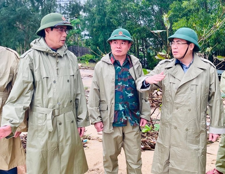 Chủ tịch UBND tỉnh Quảng Ngãi Nguyễn Hoàng Giang (đầu tiên từ phải sang) kiểm tra công tác phòng, chống bão tại xã Long Phụng.