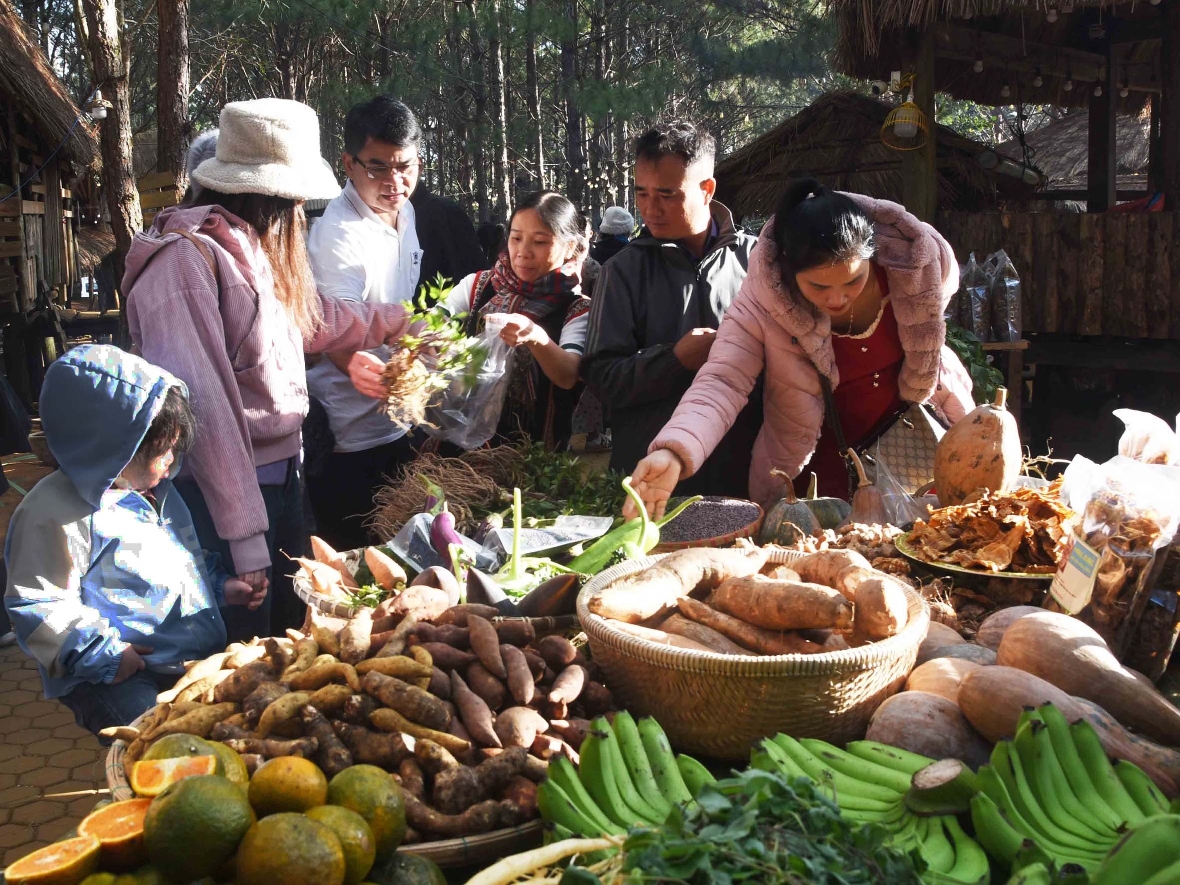 Du khách tham quan, mua sắm nông sản và dược liệu tại phiên chợ nông sản – dược liệu Măng Đen, đầu năm 2026. Ảnh: NSNA Nguyễn Đăng Lâm