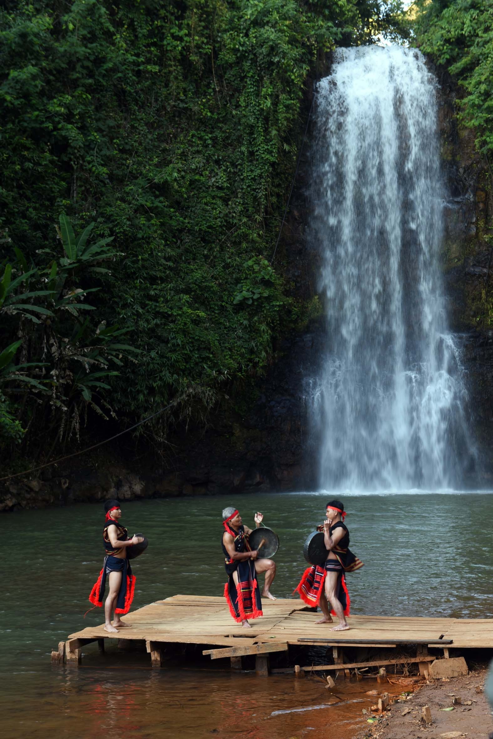 Trình diễn đấu chiêng bên thác Pa Sỹ - danh thắng nổi tiếng của Măng Đen. Ảnh: NSNA Nguyễn Đăng Lâm
