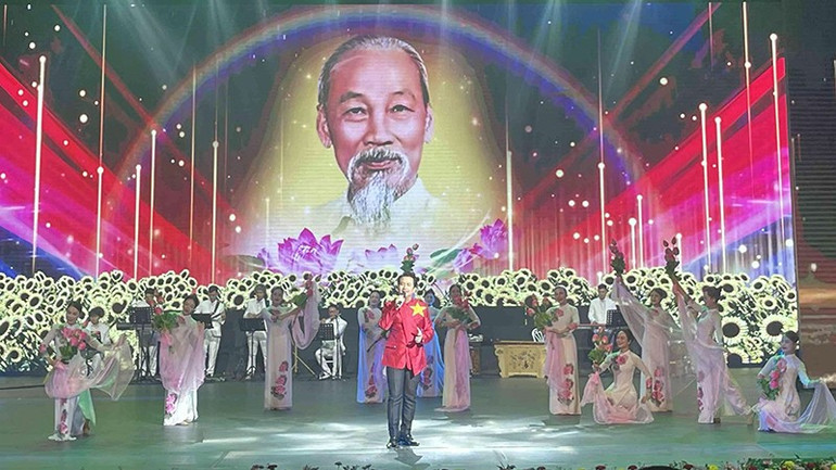 Tiết mục văn nghệ ca ngợi Chủ tịch Hồ Chí Minh. (Ảnh: DUY TOÀN)