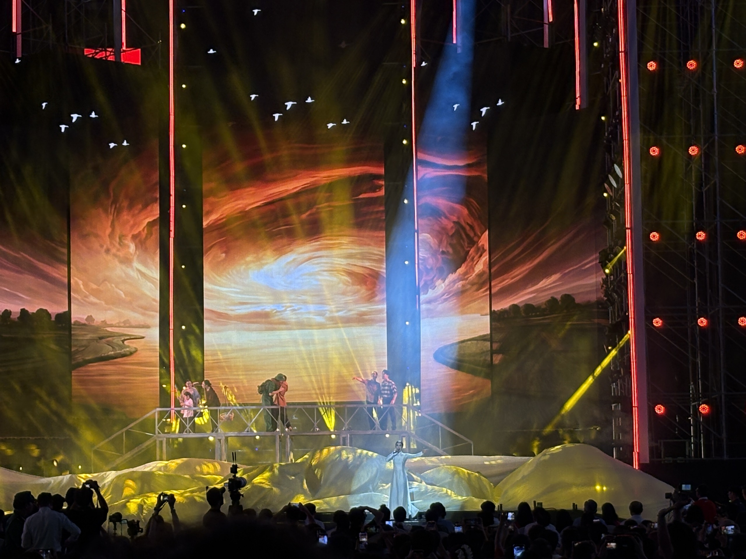 Khoảnh khắc sân khấu tái hiện không gian ký ức và tinh thần đoàn kết, gợi nhắc về một thời gian khó nhưng đầy nghĩa tình. Ảnh: HẢI NHI