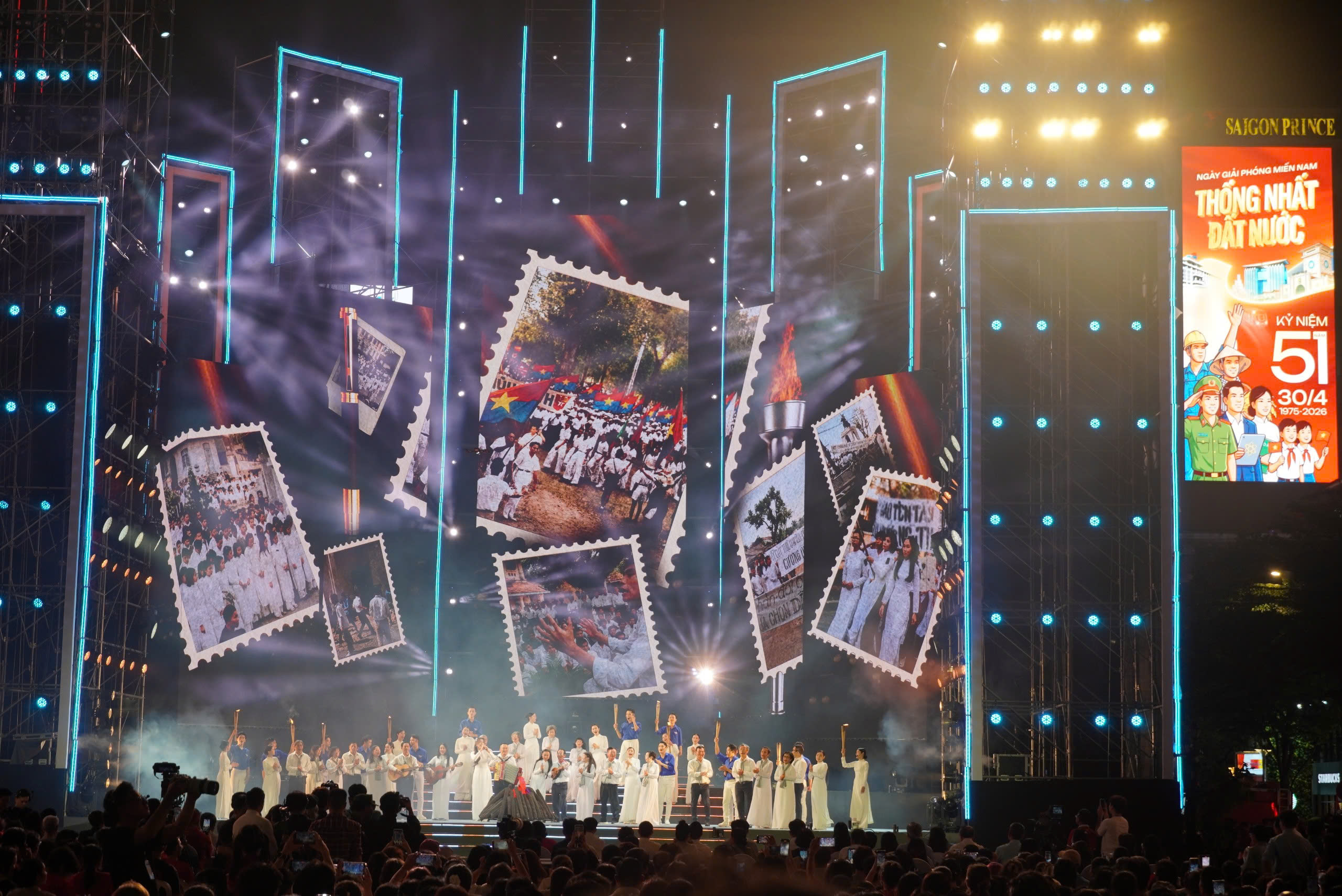 Không gian đô thị Sài Gòn trong những năm tháng đấu tranh cũng được tái hiện qua video phỏng vấn các nhân chứng lịch sử và liên khúc “Tiếng hát những đêm không ngủ - Ta thấy gì đêm nay”, trước khi đẩy cao cảm xúc bằng chuỗi tiết mục về ngày toàn thắng như “Cô gái Sài Gòn đi tải đạn”, “Lá đỏ” và “Việt Nam ngày đại thắng”.
