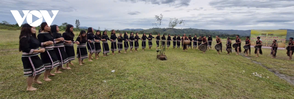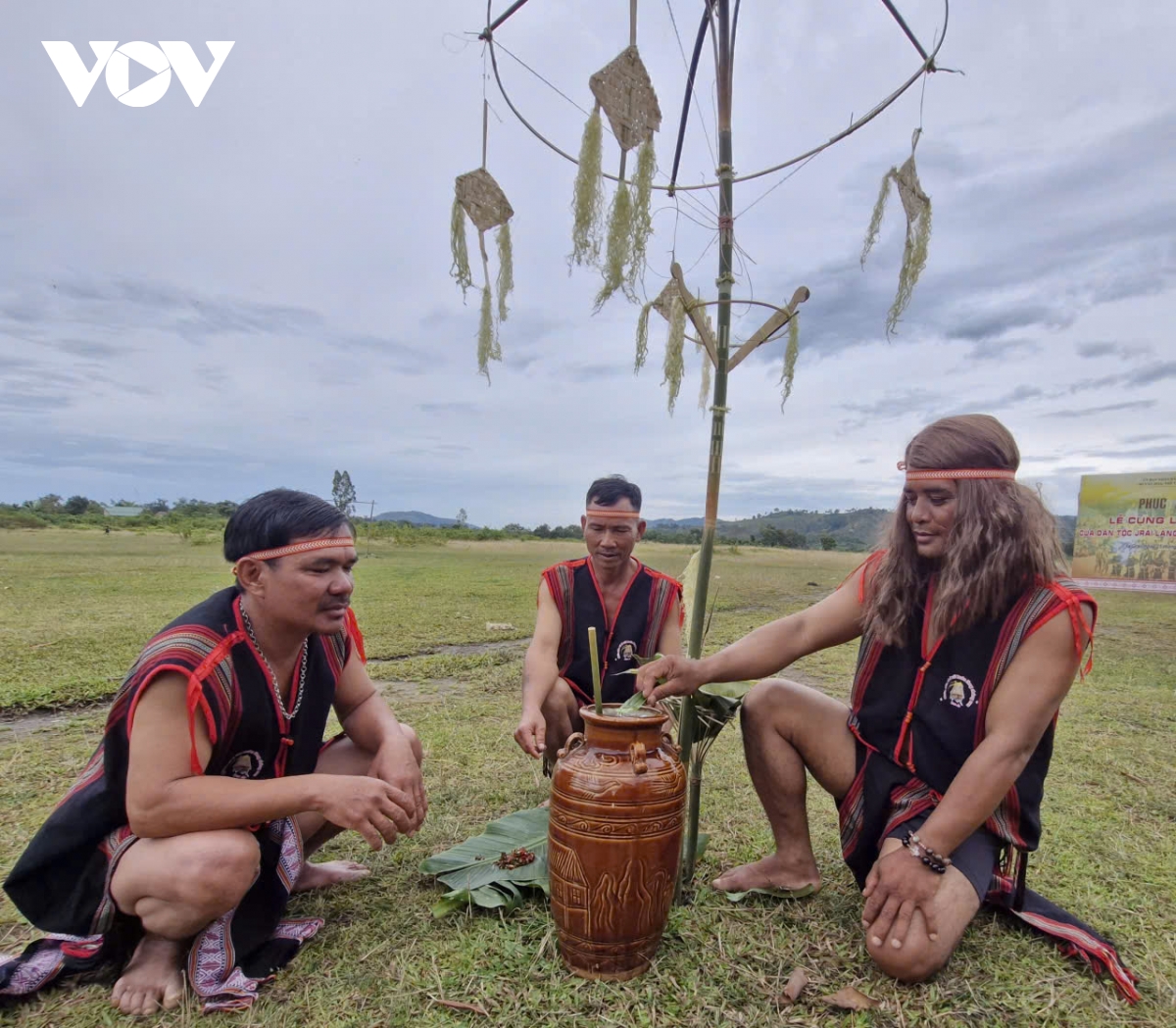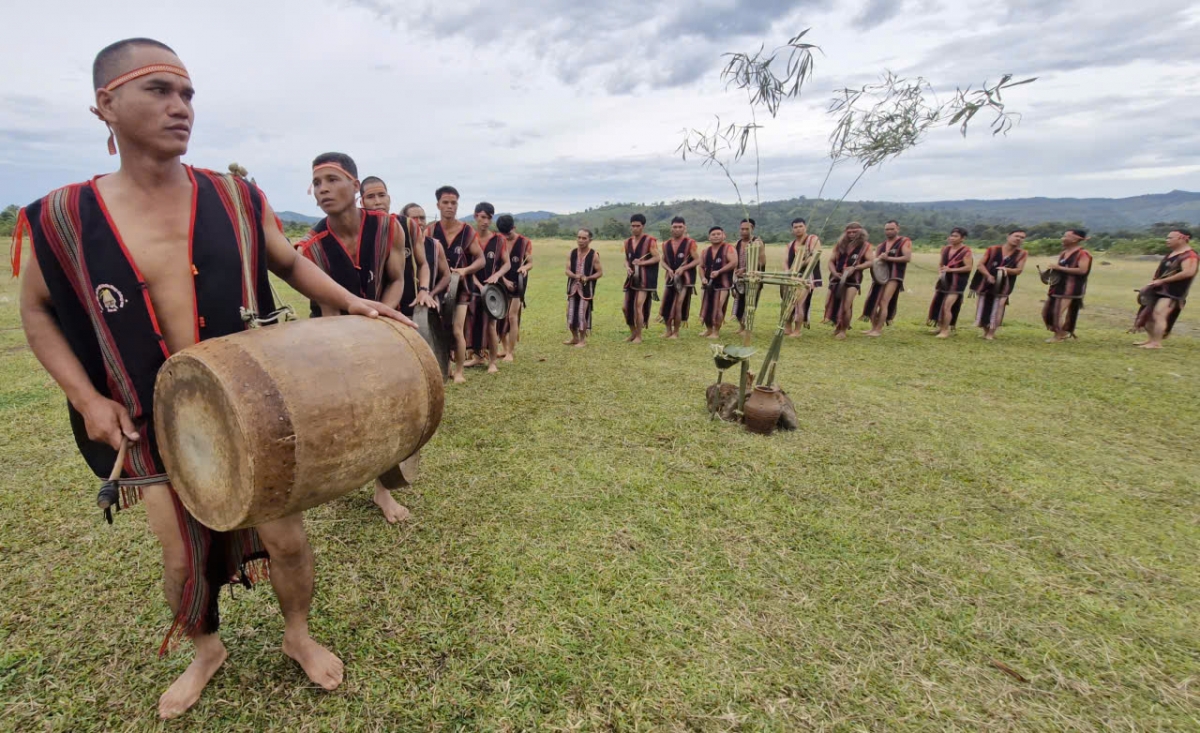 Ở khoảng đất trống cạnh giọt nước của làng, người dân đã dựng sẵn một cây nêu cao vút được được trang trí bằng dây mây và lá rừng. Khi mọi thứ đã yên vị, già làng khẽ gật đầu ra hiệu, tiếng trống lập tức vang lên, hòa cùng tiếng hú dài ngân vang khắp buôn làng. Đó là tín hiệu gọi dân làng tụ họp, mở đầu cho nghi lễ cúng lúa mùa linh thiêng.
