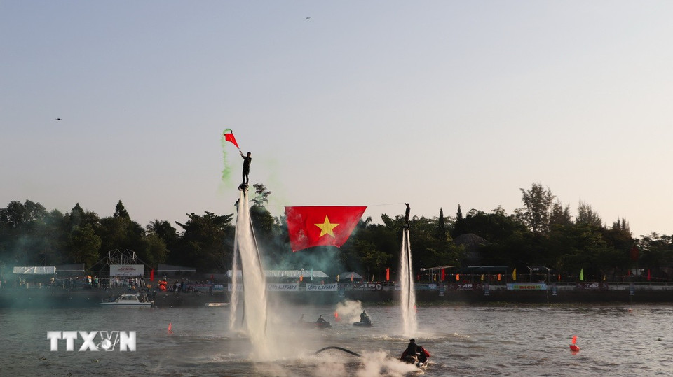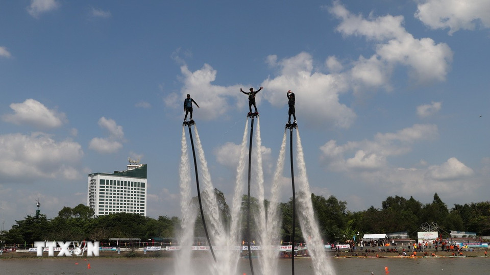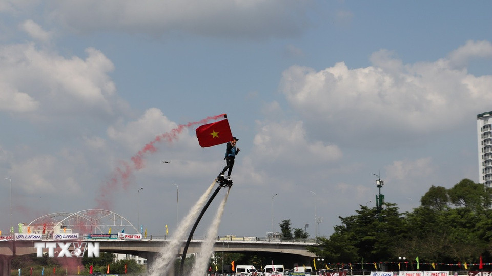 Vận động viên trình diễn các kỹ thuật của môn flyboard. (Ảnh: Hồng Thái/TTXVN)