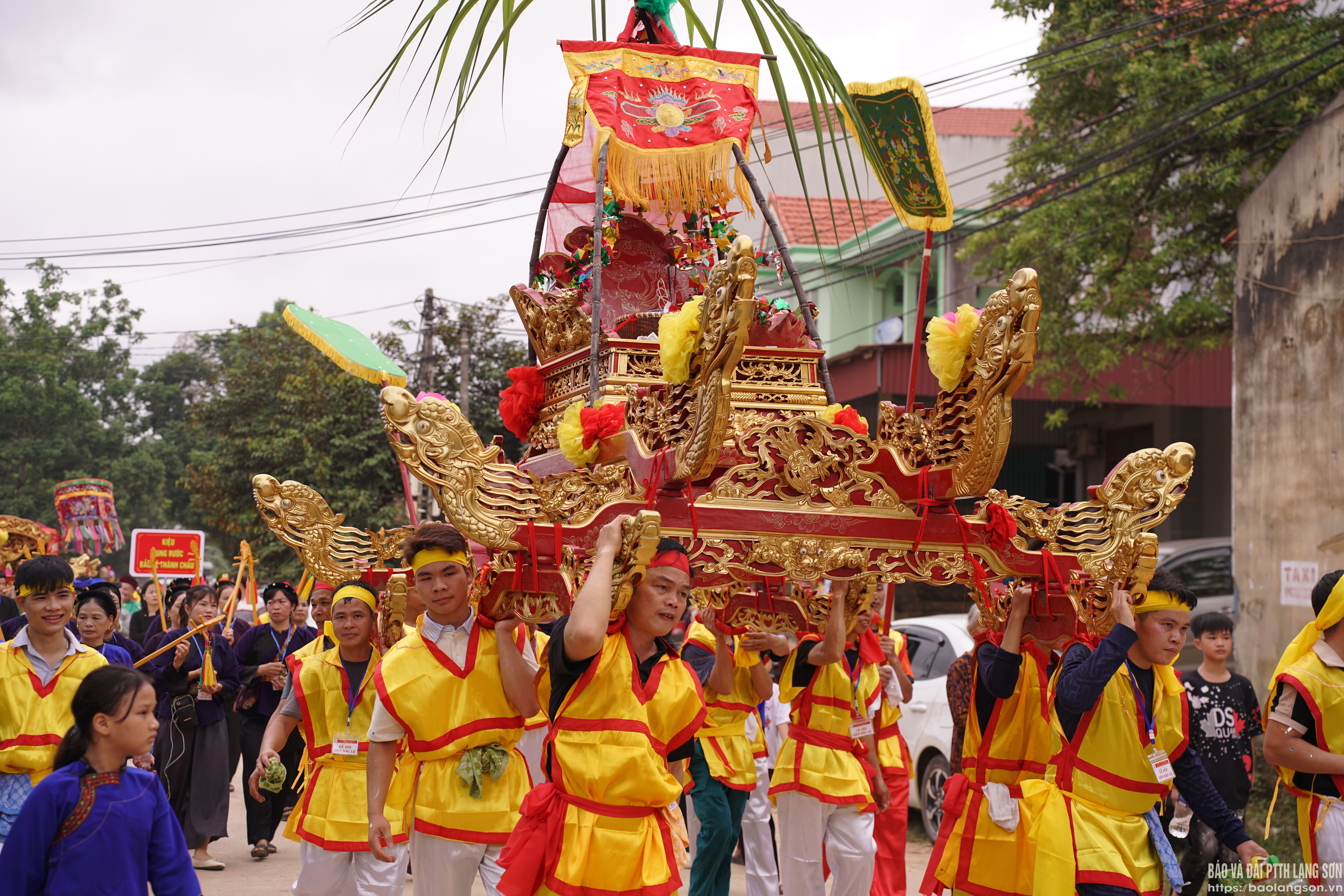 Nổi bật nhất trong đoàn rước là hai kiệu bát cống (rước quan Trần triều, rước Mẫu). Kiệu được trạm trổ kỳ công, đẹp mắt, khiêng mỗi kiệu có 8 thanh niên trai tráng khỏe khoắn