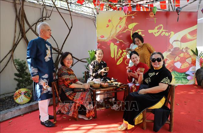 Với sự đồng hành của các nghệ sĩ, nghệ nhân thuộc Trung tâm Xúc tiến, quảng bá di sản văn hóa phi vật thể Việt Nam, chương trình Tết cộng đồng năm nay càng đặc biệt hơn khi khách tham dự có thể trải nghiệm văn hóa truyền thống Việt qua trò chơi múa sạp, viết thư pháp, in tranh Đông Hồ, cùng thưởng trà với kẹo lạc, chè lam, mứt gừng ngọt bùi ký ức, hay lắng nghe âm nhạc dân gian qua làn điệu múa chèo. Chương trình cũng thêm phần thú vị với tiết mục hát xẩm của các du học sinh và màn biểu diễn hồn nhiên của các cháu bé thiếu nhi là con em cán bộ nhân viên Đại sứ quán. Giữa tiếng cười nói và âm thanh rộn ràng, Tết trở thành sợi dây kết nối cộng đồng người Việt xa quê.