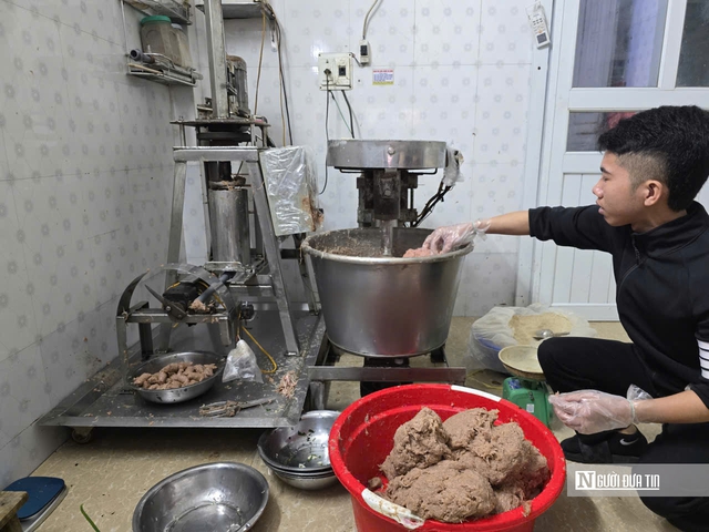 Thực phẩm sẽ quyết định chất lượng của nem. Thịt lợn phải tươi, ngon, là thịt nạc bắp. Khi nhập thịt về, anh Tuyên là người trực tiếp xay thịt, tẩm ướp gia vị. Đây là khâu rất quan trọng trong quá trình sản xuất nem và 25 năm nay chủ cơ sở vẫn phải đảm nhiệm.