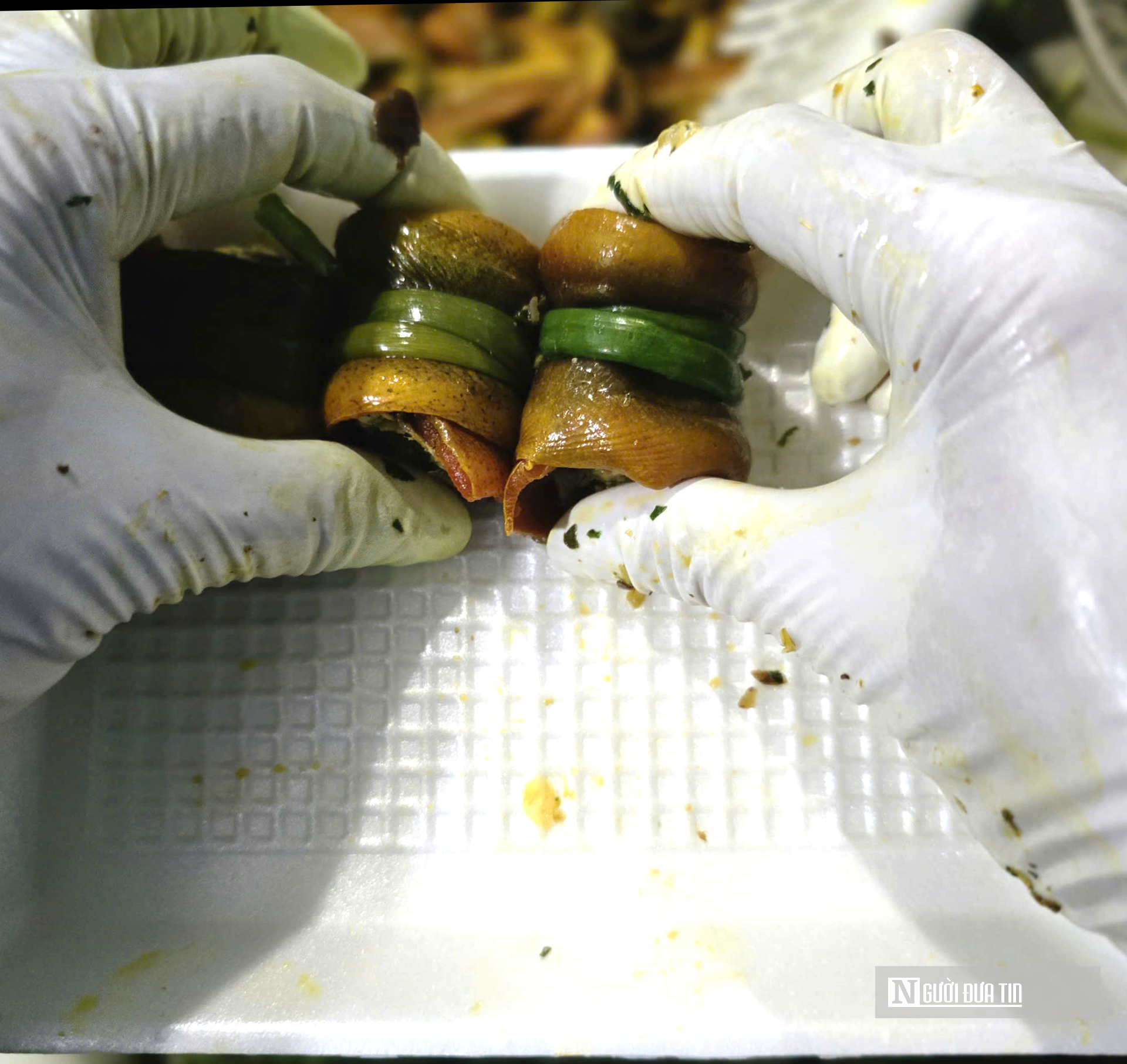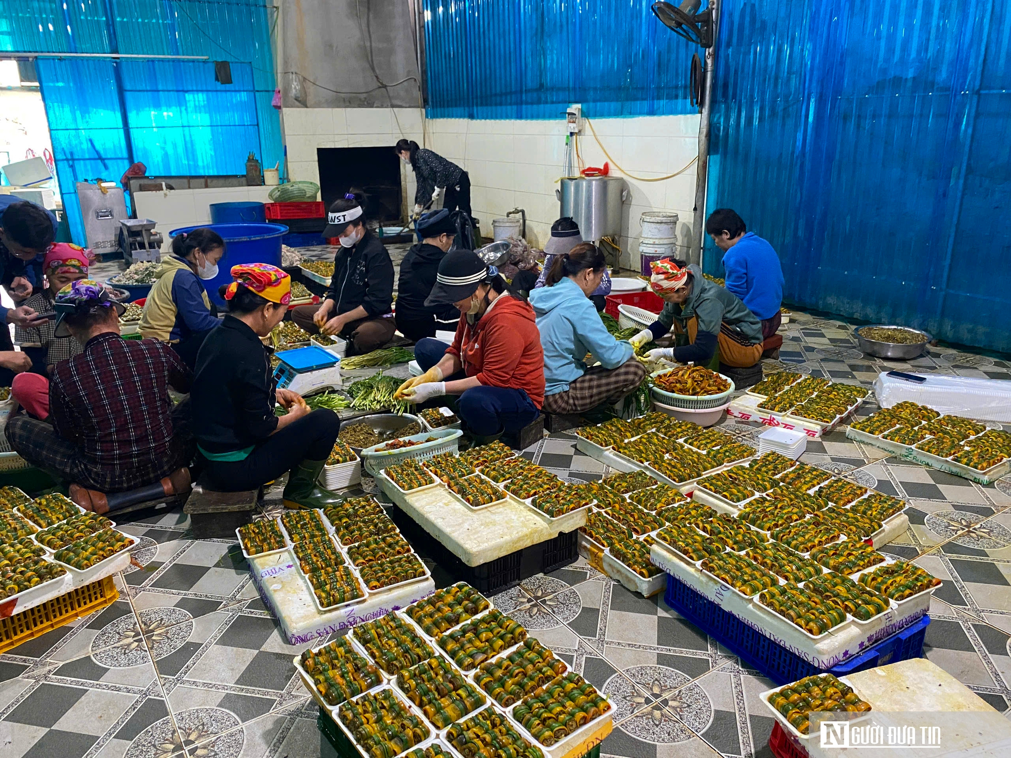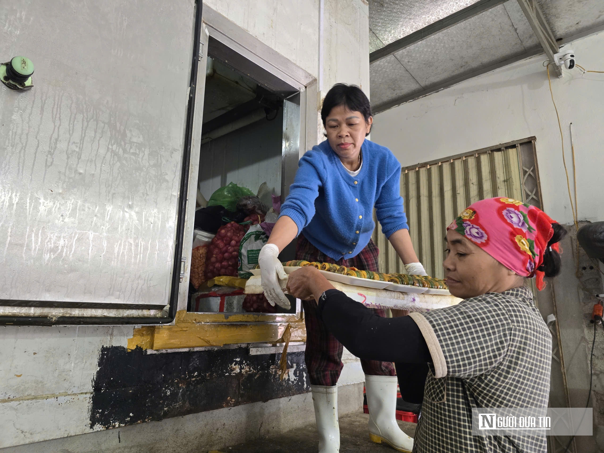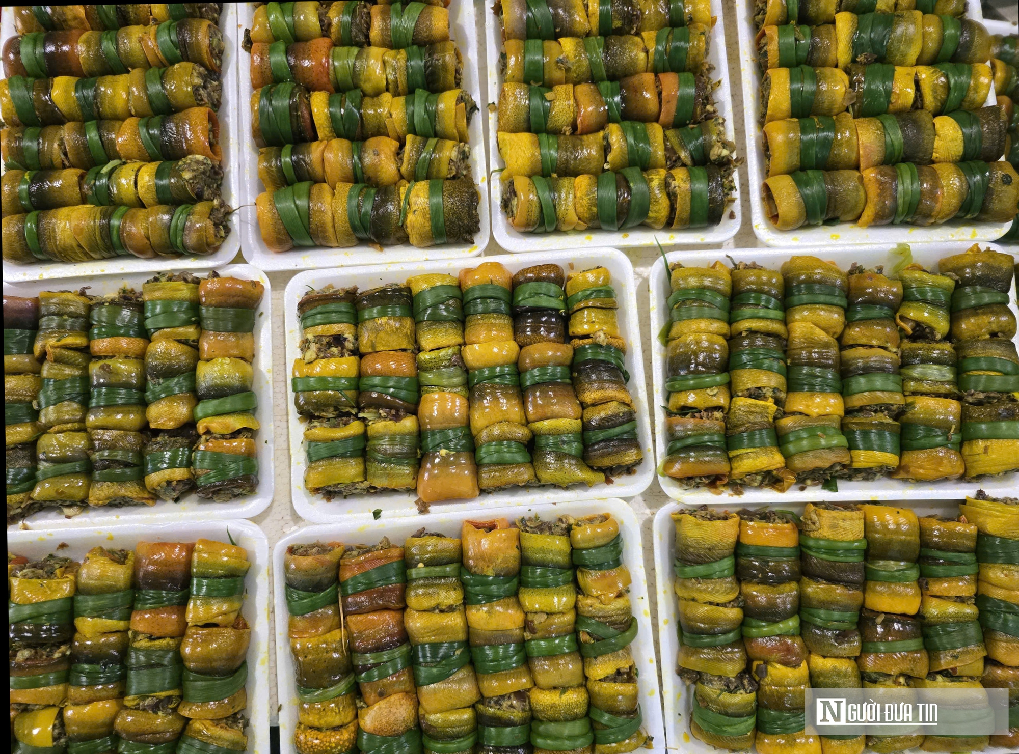 Lươn cuộn thịt được xem là sản phẩm chạy nhất vào mỗi dịp Tết đến. Nguyên liệu của lươn cuộn gồm: thịt heo nạc được băm nhuyễn, trộn đều với gia vị để làm nhân, sau đó cuộn cùng lươn, buộc chặt bằng hành lá. Mỗi khay có từ 18 - 20 cuộn lươn, được xếp và đưa vào tủ cấp đông từ 2 - 3 tiếng trước khi xuất bán. Đây là sản phẩm khách hàng ưa chuộng để về ăn Tết và làm quà biếu”, bà Nguyễn Thị Mai, trú tại làng Phan Thanh cho biết.