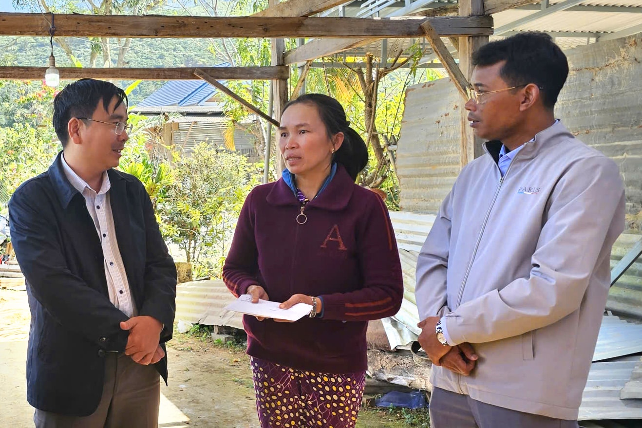 Đồng chí N'Du Ha Biên, Ủy viên Ban Chấp hành Đảng bộ tỉnh Lâm Đồng, Bí thư Đảng ủy xã Đam Rông 2 (bìa phải) động viên, trao quà hỗ trợ xây dựng nhà cho hộ nghèo