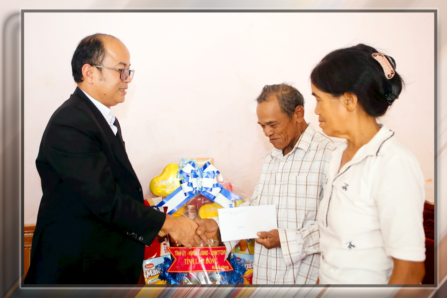 Ủy viên Ban Thường vụ Tỉnh ủy, Phó Chủ tịch HĐND tỉnh Lâm Đồng Y Quang BKrông (bên trái) tặng quà và động viên gia đình bệnh binh K'Von, bon Ka La Du, xã Quảng Khê