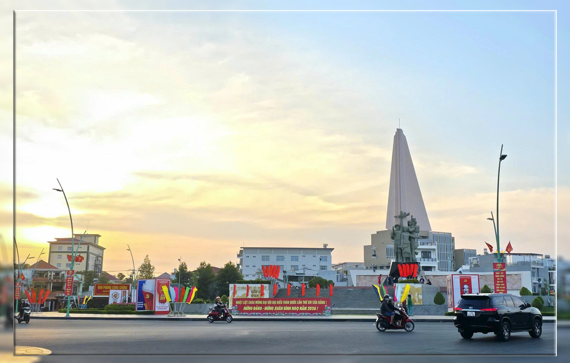 Khu vực Tượng đài chiến thắng, phường Phan Thiết, tỉnh Lâm Đồng được trang trí cờ hoa rực rỡ chào mừng Đại hội XIV của Đảng. Ảnh: Long Thiệu