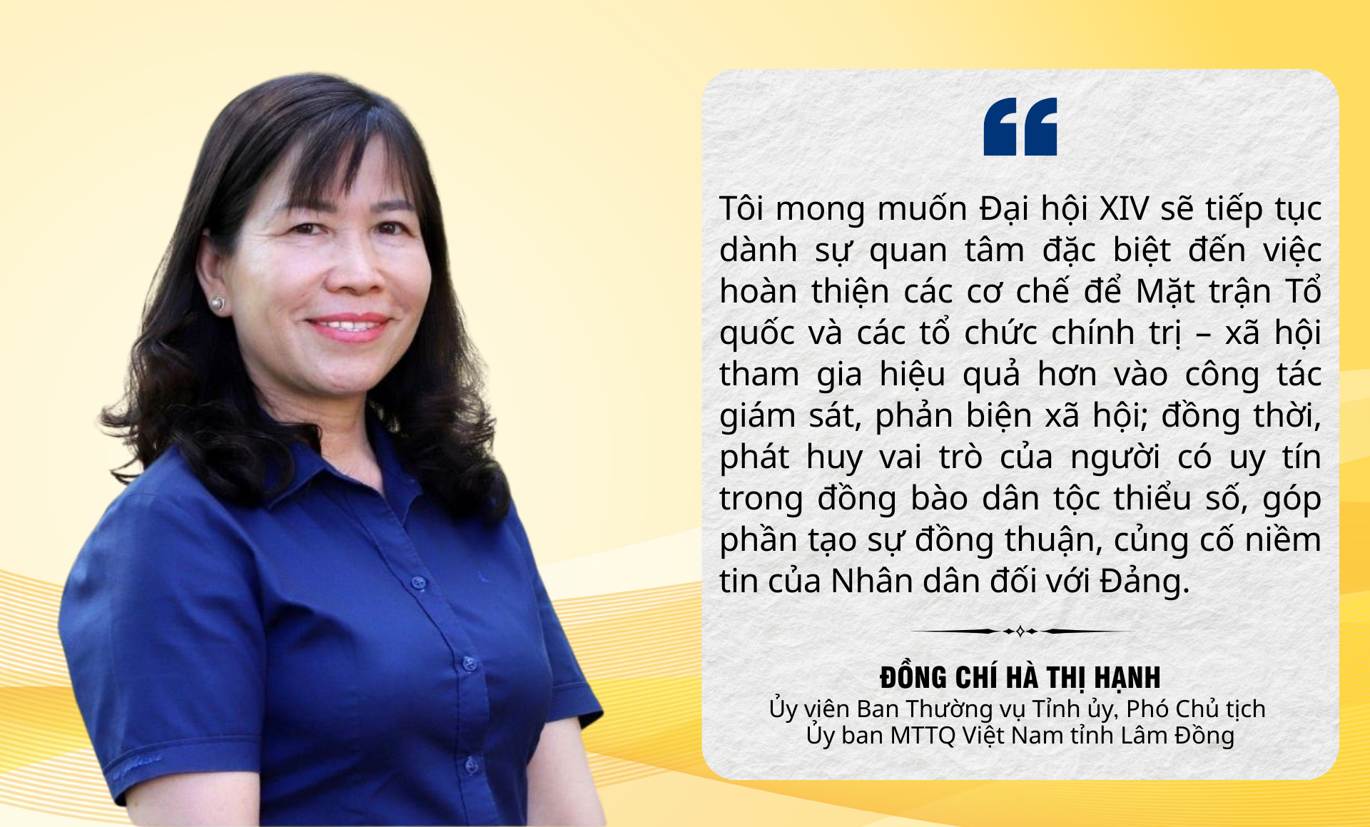Đồng chí Hà Thị Hạnh, Ủy viên Ban Thường vụ Tỉnh ủy, Phó Chủ tịch Ủy ban MTTQ Việt Nam tỉnh Lâm Đồng cho biết: Đại hội XIV của Đảng diễn ra trong bối cảnh đất nước đứng trước nhiều thời cơ và thách thức đan xen. Điều quan trọng nhất là tiếp tục củng cố, phát huy sức mạnh khối đại đoàn kết toàn dân tộc – nền tảng vững chắc để thực hiện thắng lợi mọi mục tiêu phát triển.